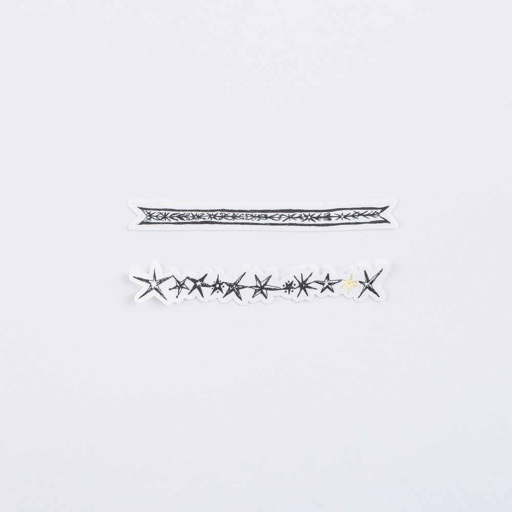 The line stickers, depicting an embroidered ribbon and a line of stars, can be mixed and matched freely. They are ideal for dividing pages or highlighting areas too large for the frame stickers.