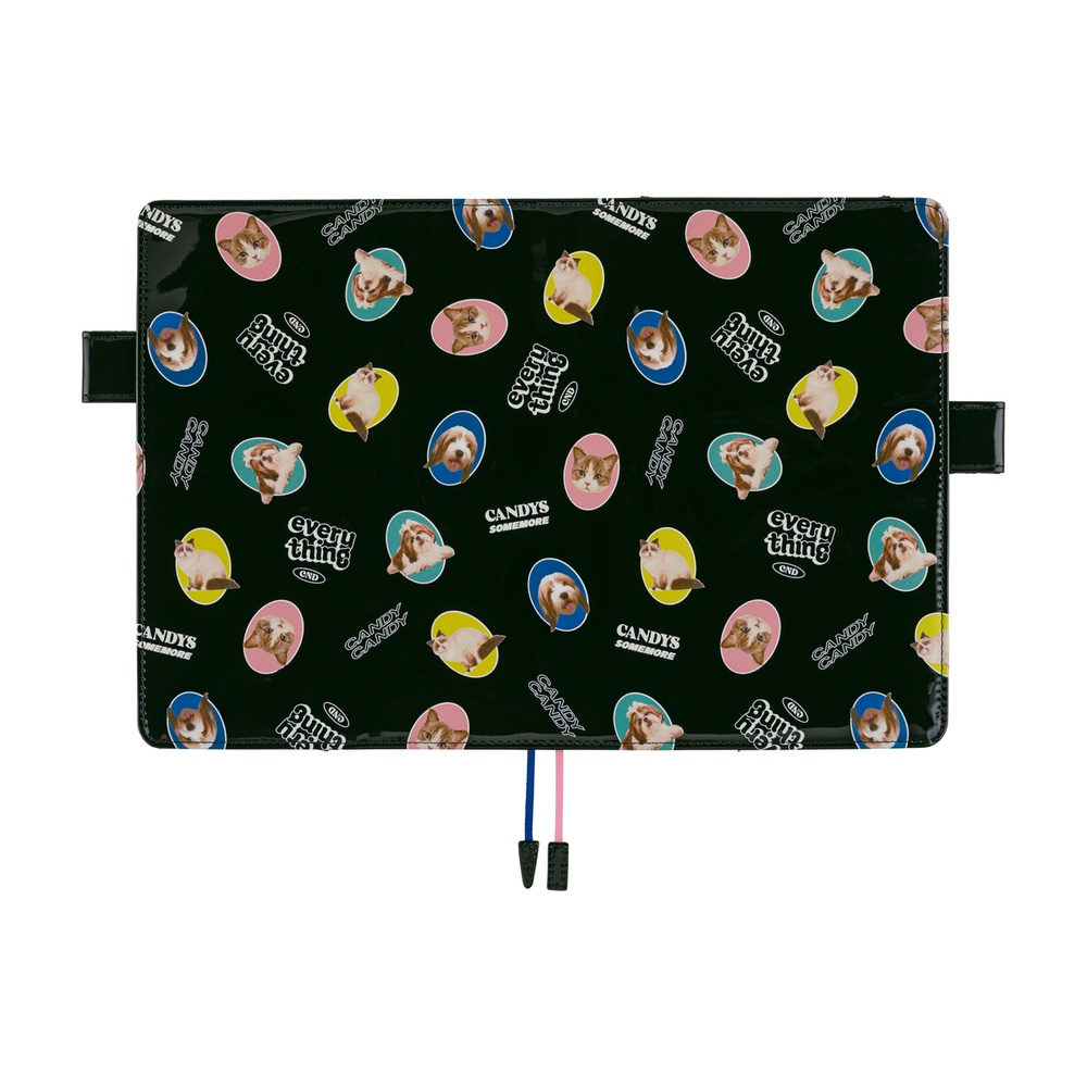 The cover is made of glossy enamel material on a chic black background, scattered with adorable dog and cat photos placed randomly across the surface, interspersed with English text. The shiny texture and vibrant design bring out a pop-style energy full of charm and humor.