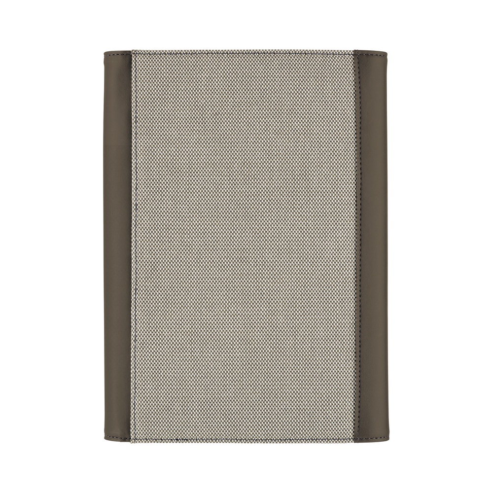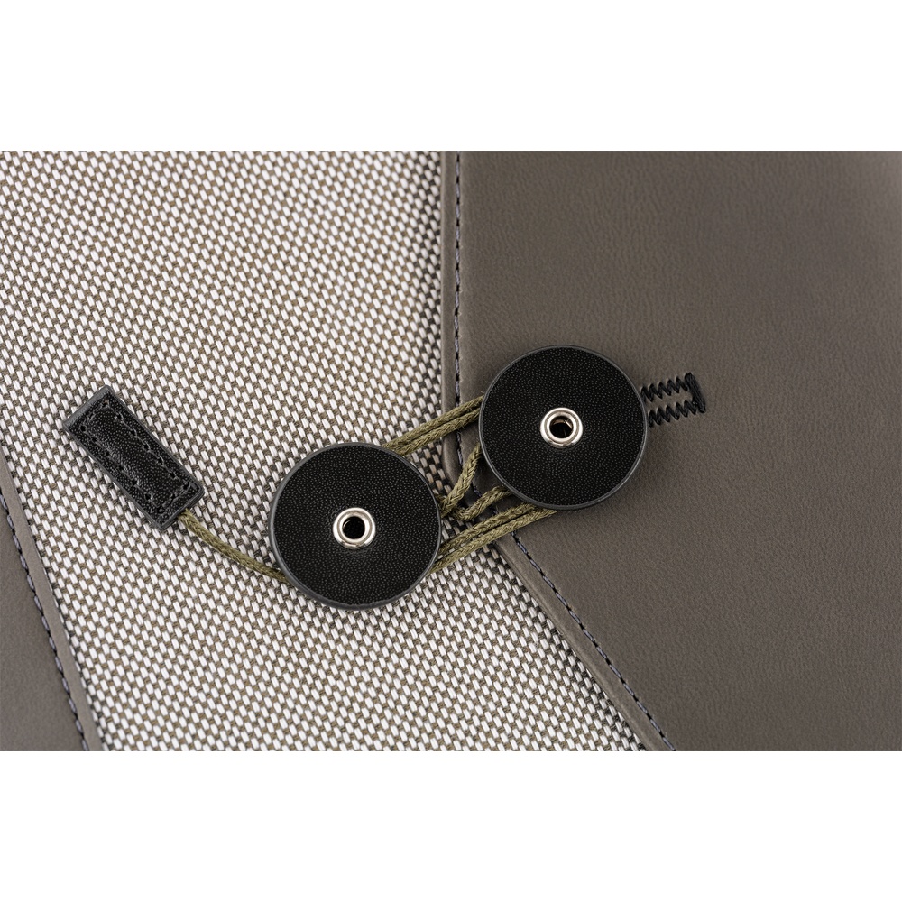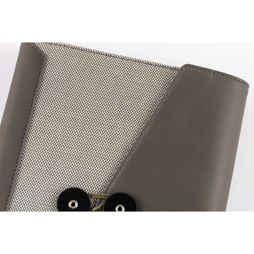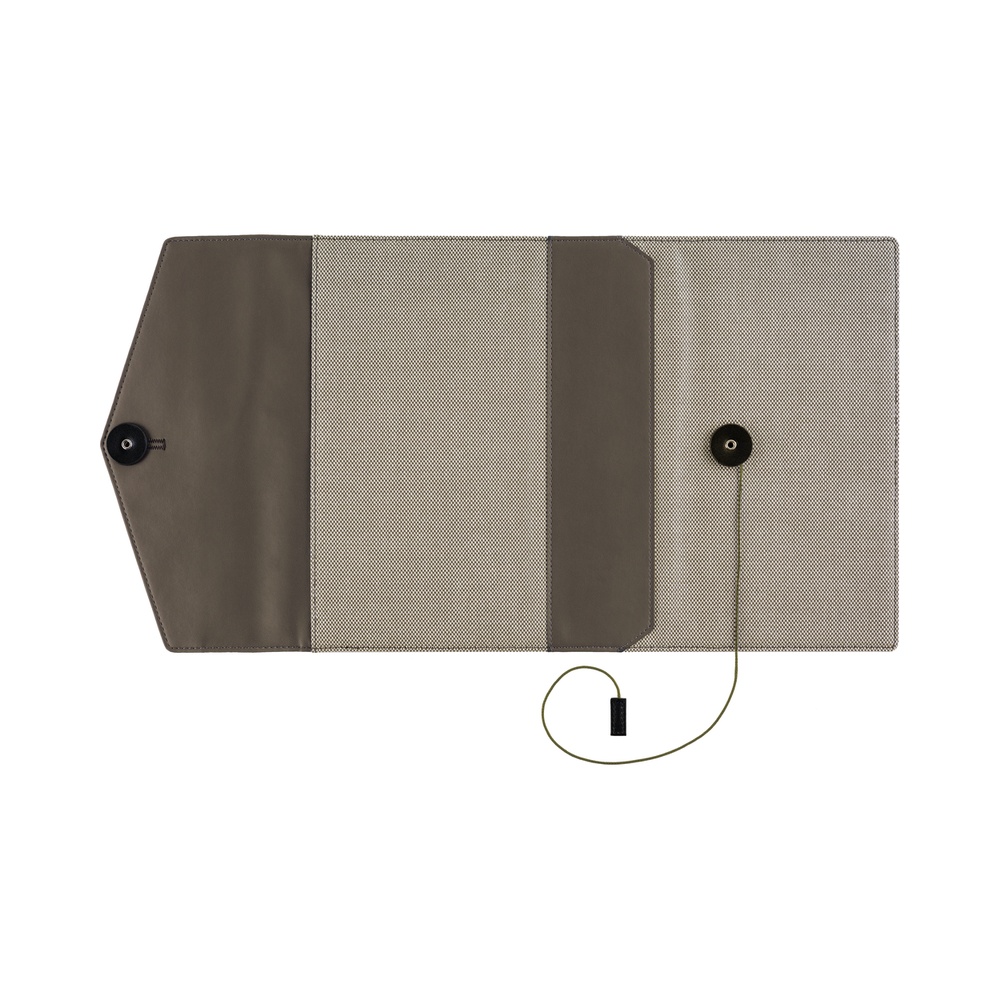 A5 envelope-style cover with triangular flap, smoky gray and Spanish acrylic fabric, leather button and khaki string closure. Elegant, refined, with internal pen hook.