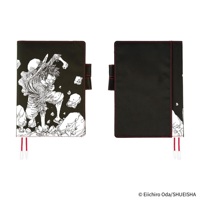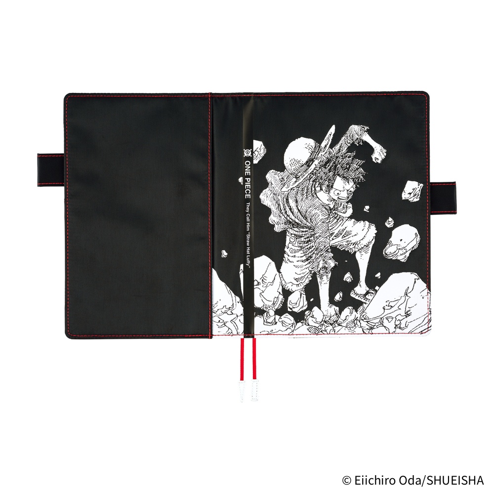 A5 black cover in collaboration with ONE PIECE magazine. Features silk-screen Luffy illustration, red stitching, book-like spine with quote, Gear Second interior, and hidden words in the back pocket.