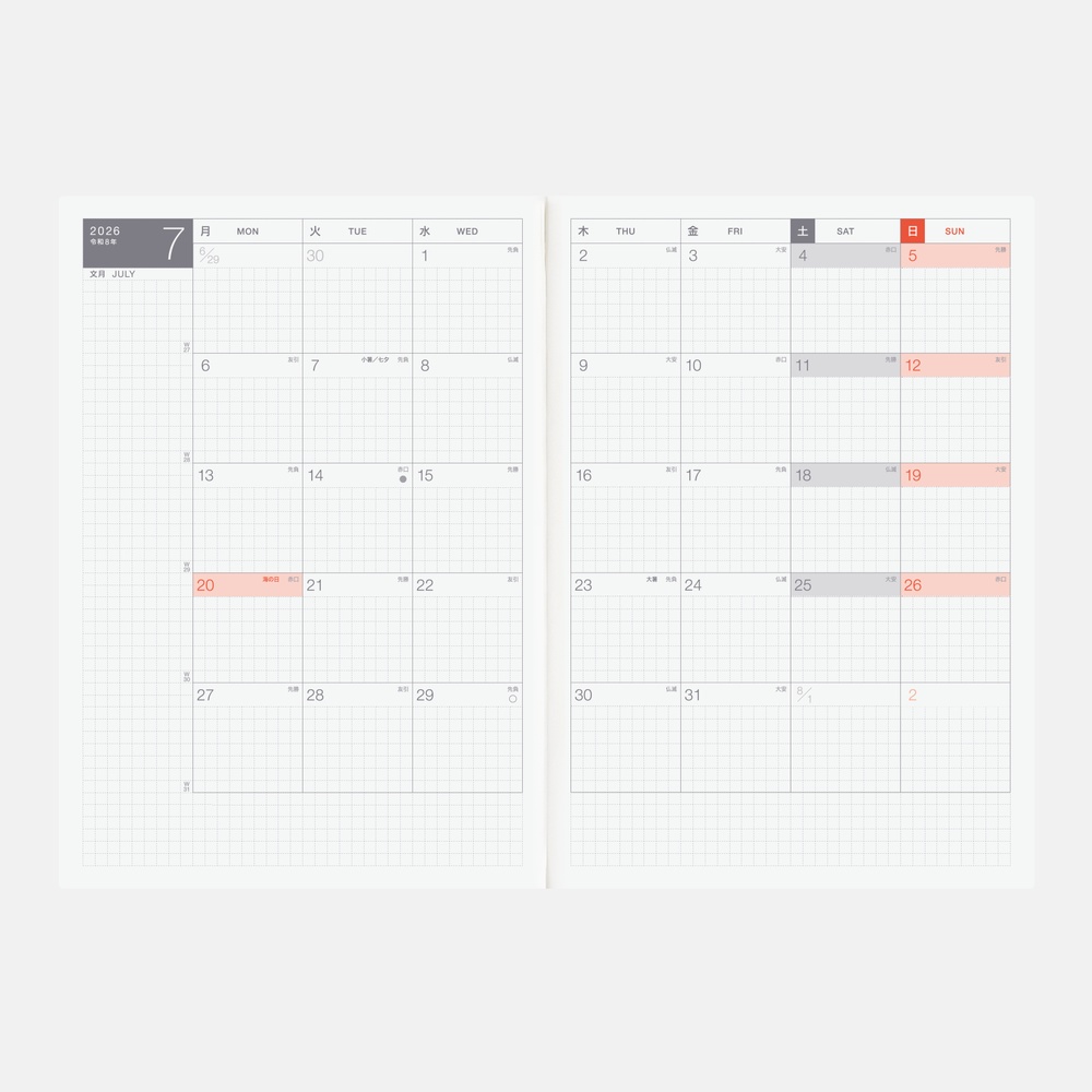 An A5 daily planner starting April 2026. Features one page per day, exclusive weekly pages with time schedules, Tomoe River paper, and a lay-flat binding.