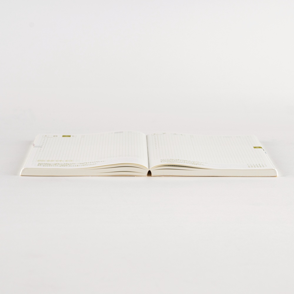 The daily pages are printed on 3.7 mm graph paper, refined through years of testing to provide optimal writing comfort. The grid is printed in light, subtle colors, allowing users to write freely from any starting point or ignore the grid entirely.