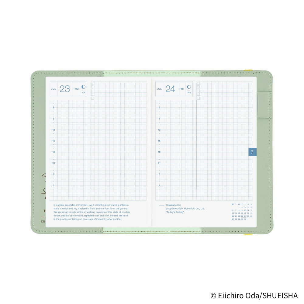 The interior features a blue-tinged peppermint green. On the left pocket, you’ll find the collaborative logo of ONE PIECE magazine and Hobonichi Techo. Hidden inside the book slot is a special message: when Luffy speaks of the end of his dream, Tony Tony Chopper looks at him with admiration and says, “That's great, LUFFY! What a great dream!!!”
