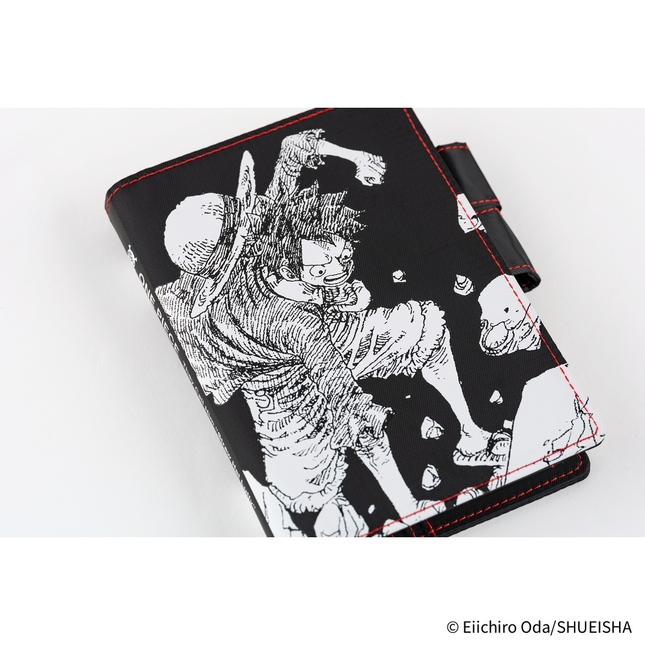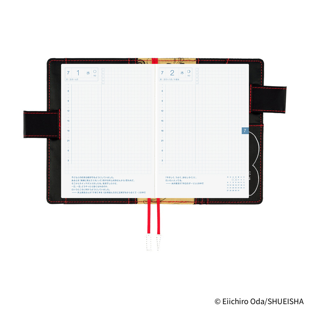 Hobonichi A6 ONE PIECE Straw Hat Luffy is a cover in black with Oda’s silk-screen art, red stitching and bookmark, interior Gear 2 scene, a new power activated by Luffy and hidden details. A tribute to the spirit of Luffy.