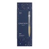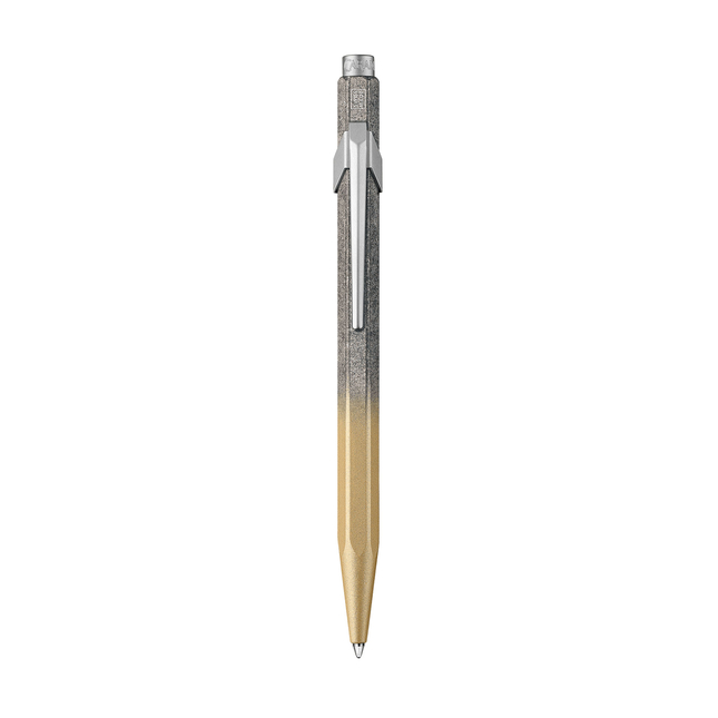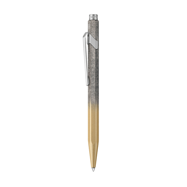 Caran d'Ache 849 Cosmic Blue Gilded ballpoint pen invites you to dream as it whisks you off to the very heart of the cosmos. The hexagonal aluminium body features a gold color with shades of grey.