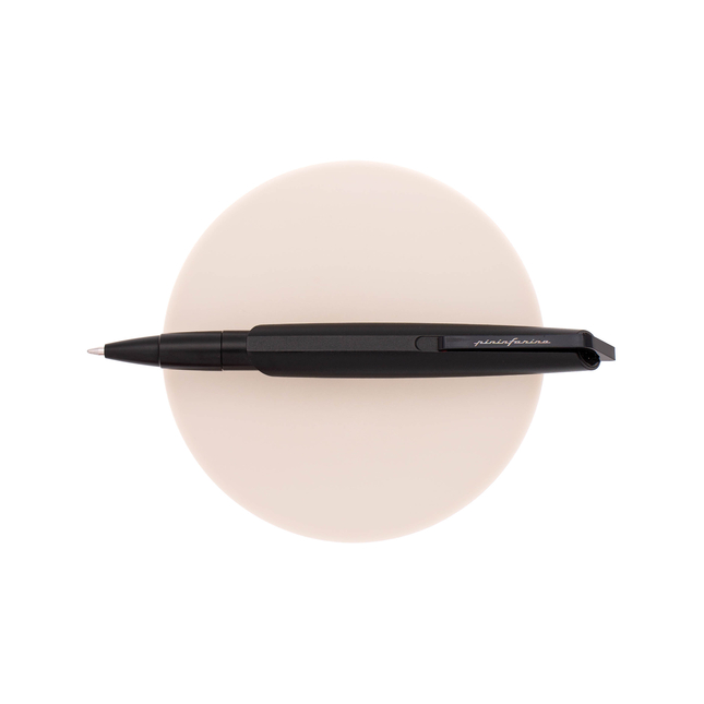 Pininfarina PF GO black ballpoint pen is made of satin black aluminum for body and cap. Opening mechanism works by screwing the aluminium part on grip section.