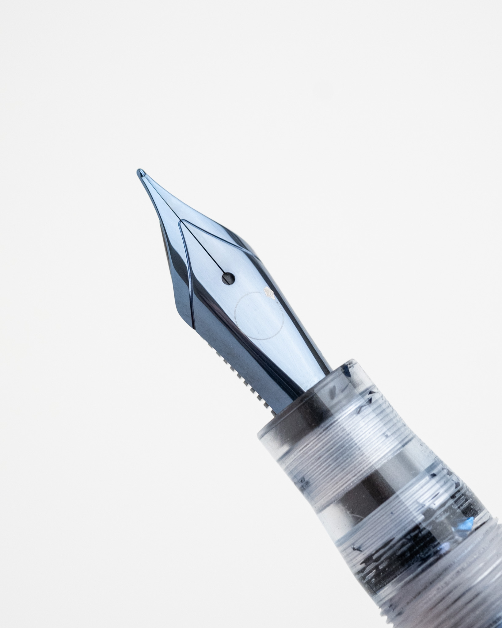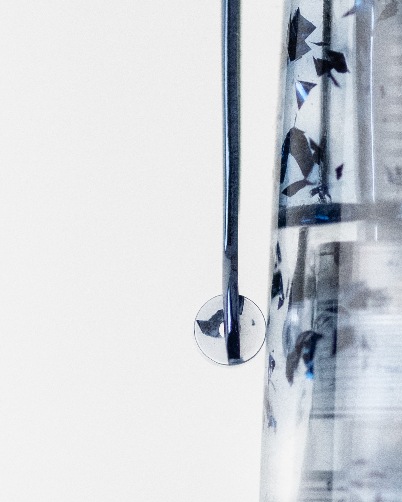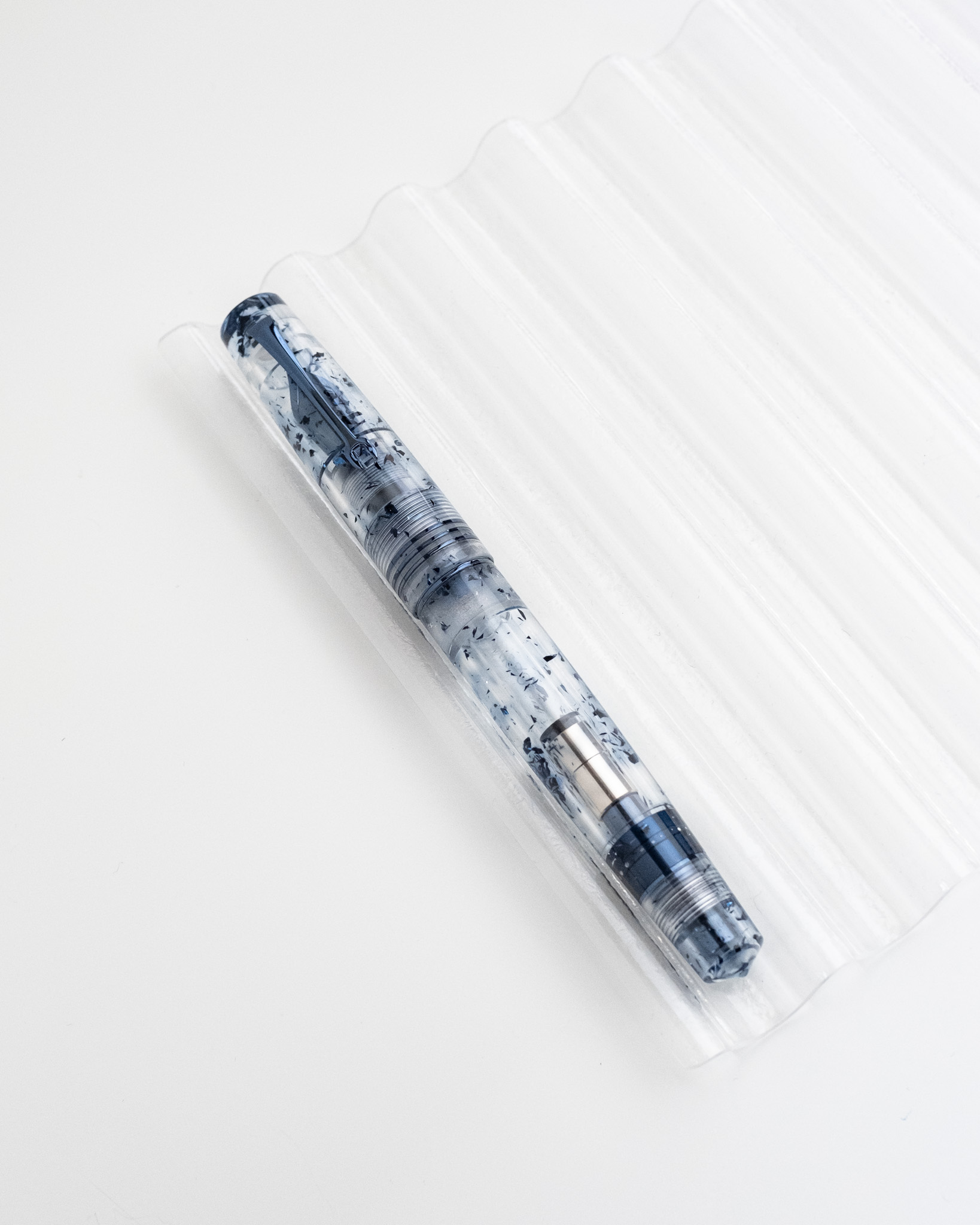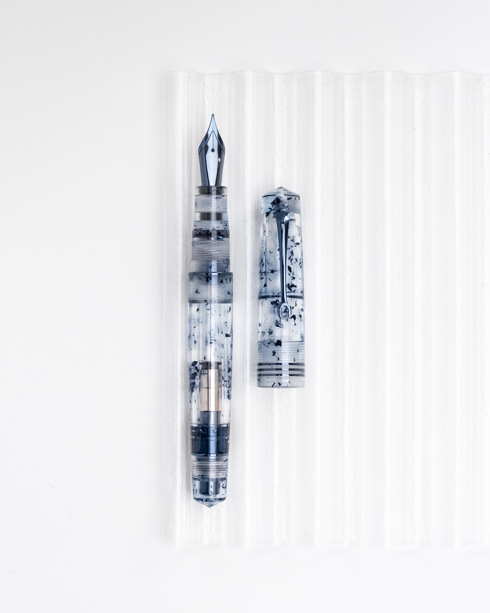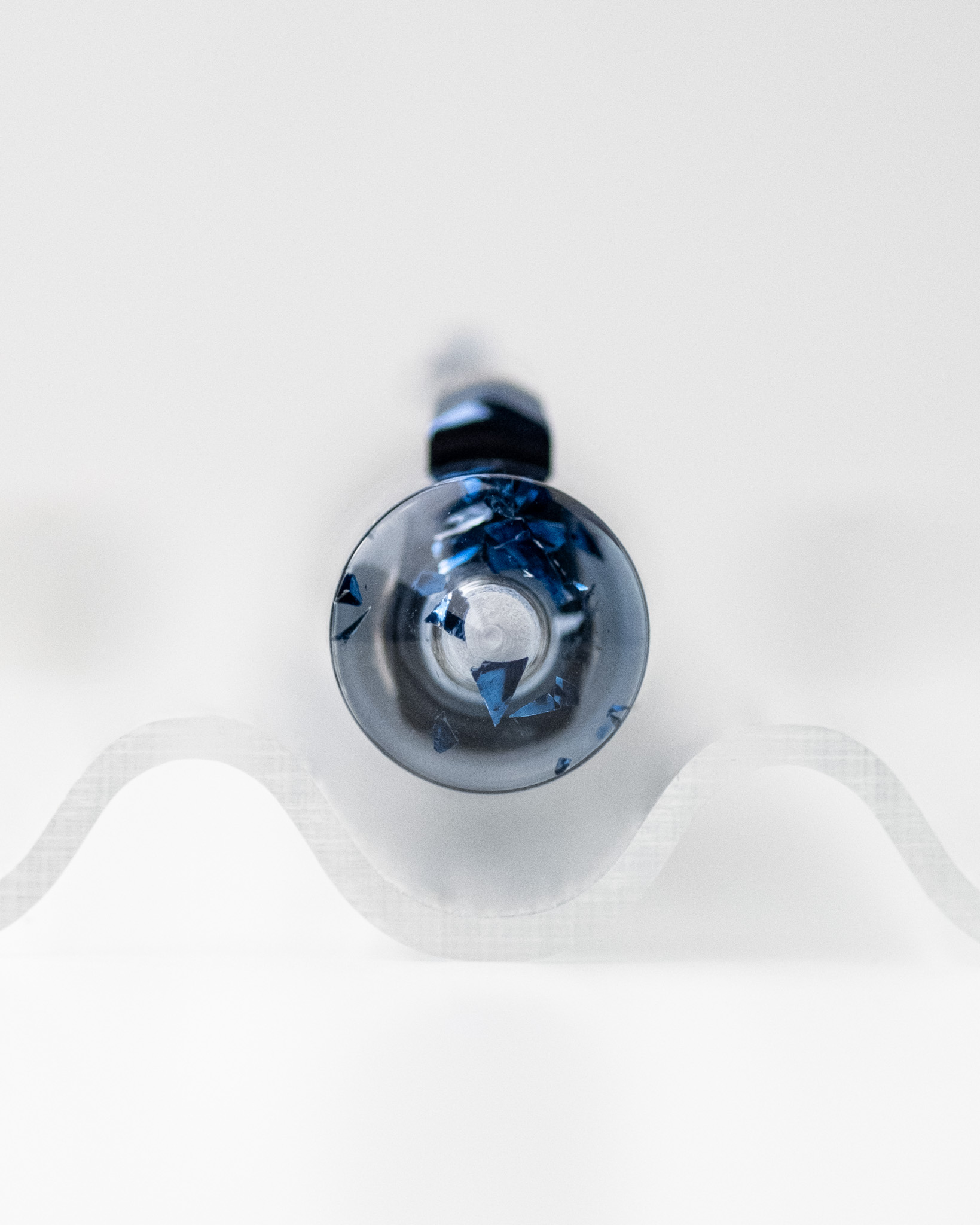 To honor this balance, every detail has been carefully designed. The blue metal trims echo the color of the fragments, while the blue steel nib engraved with the Stilo&Stile logo creates perfect continuity between form and writing. The rotating clip wheel, handcrafted using the same material as the body, becomes the meeting point between technique and poetry, a quiet detail that completes the character of the pen.