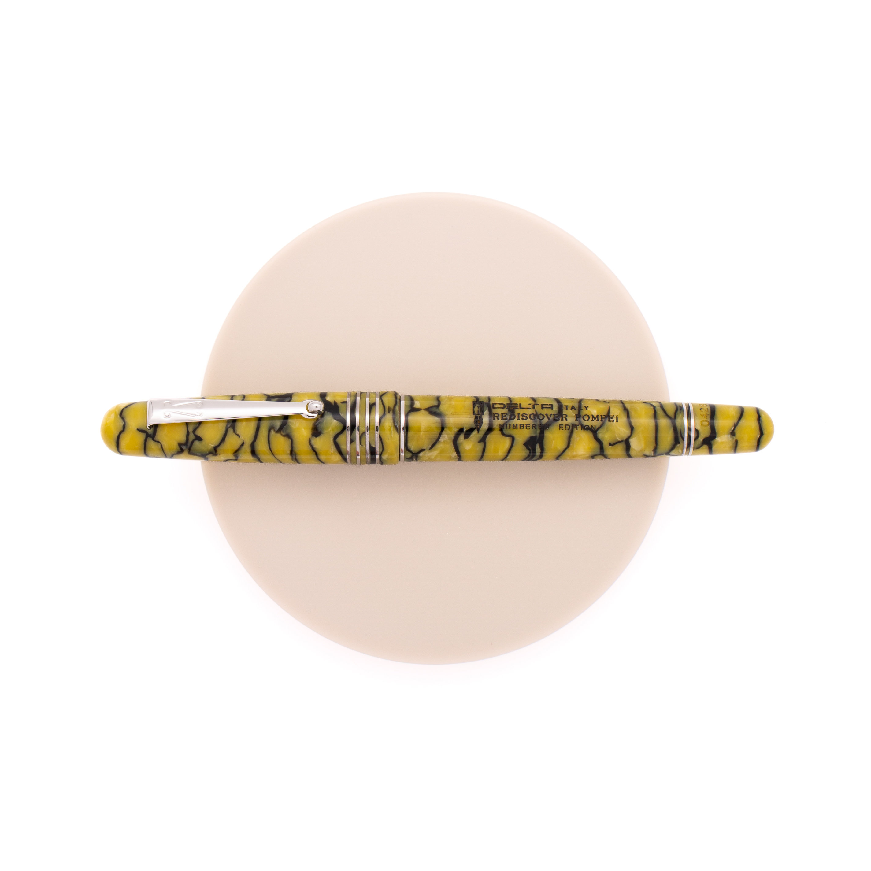 The Delta Rediscover Pompei returns from Delta’s historical archives in a faithful revival of the original spirit: a celluloid fountain pen made in Italy and fitted with a 14k gold #5 nib. Each piece is individually numbered and continues the original edition’s numbering, underscoring its collectible nature and historical continuity.
