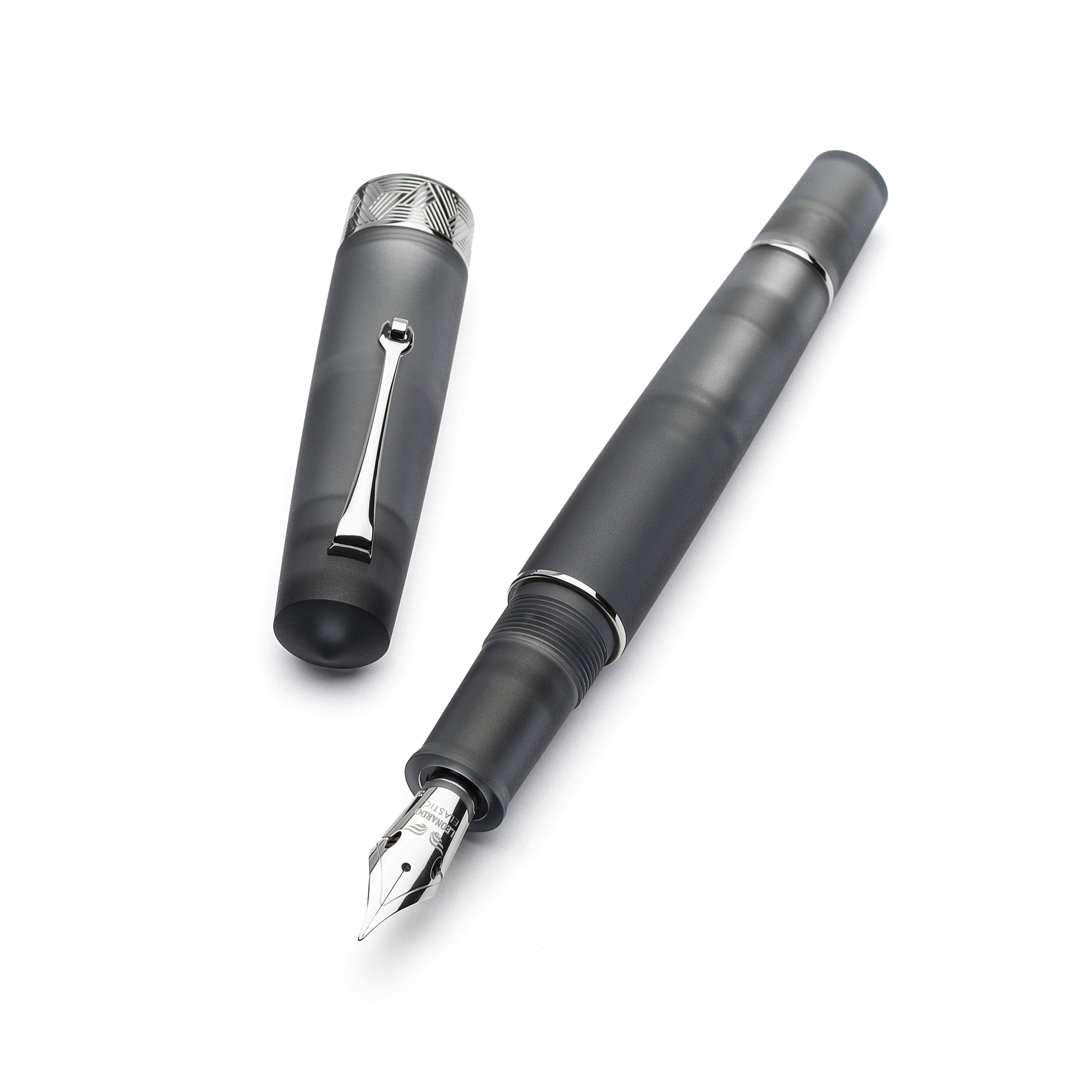 The Leonardo Momento Zero Grande Pura Grey & Rhodium 14k is made of satin transparent resin achieved through quartz sandblasting and features the new engraved cap band inspired by Greek Geometric Art. It is equipped with a 14k gold #6 La Fenice nib with ebonite feed and an integrated piston filling system with 1.5 ml capacity.
