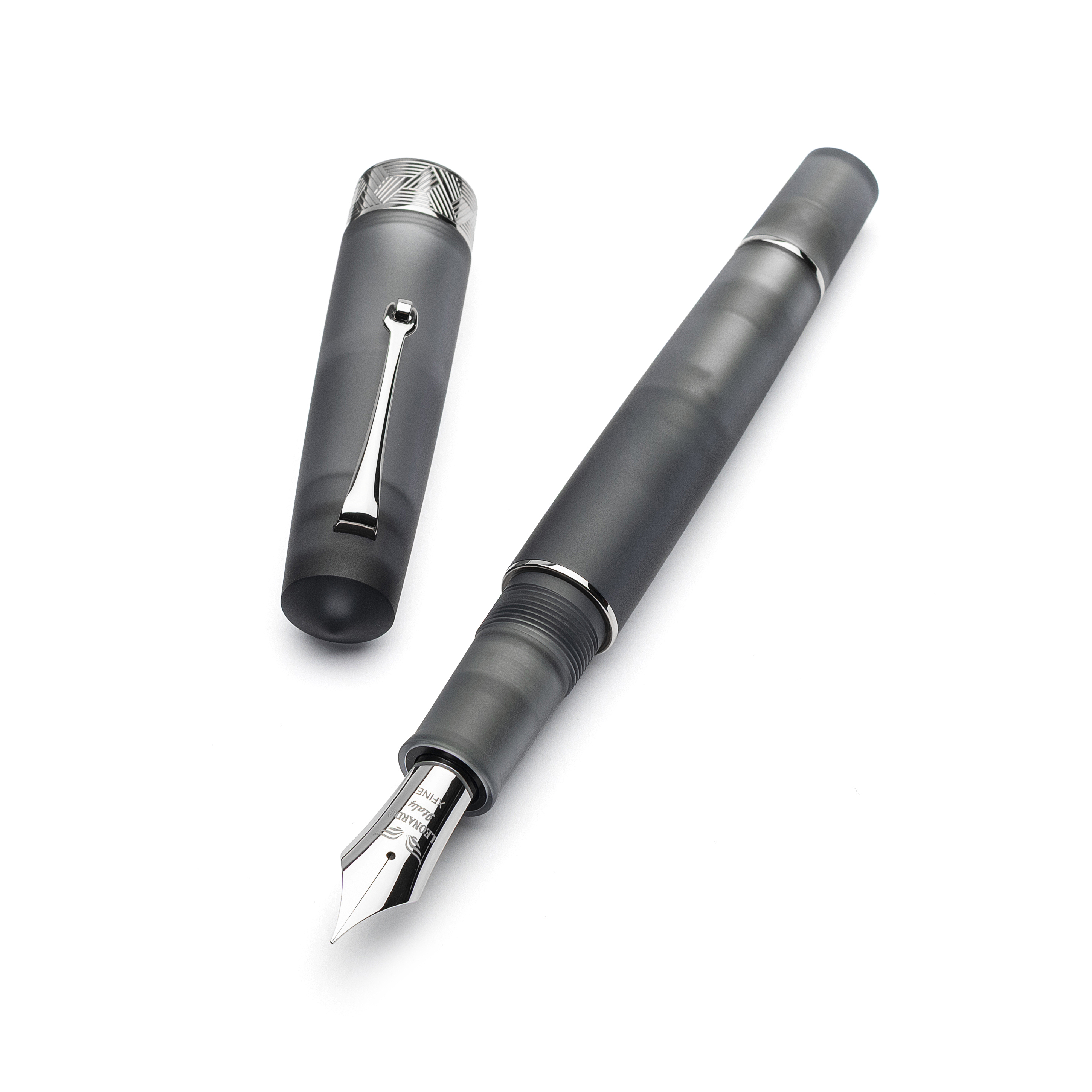 The Leonardo Momento Zero Grande Pura Grey & Rhodium #8 is made of satin transparent resin achieved through quartz sandblasting and features the new engraved cap band inspired by Greek Geometric Art. It is equipped with a steel #8 nib with ebonite feed and an integrated piston filling system with 1.5 ml capacity.