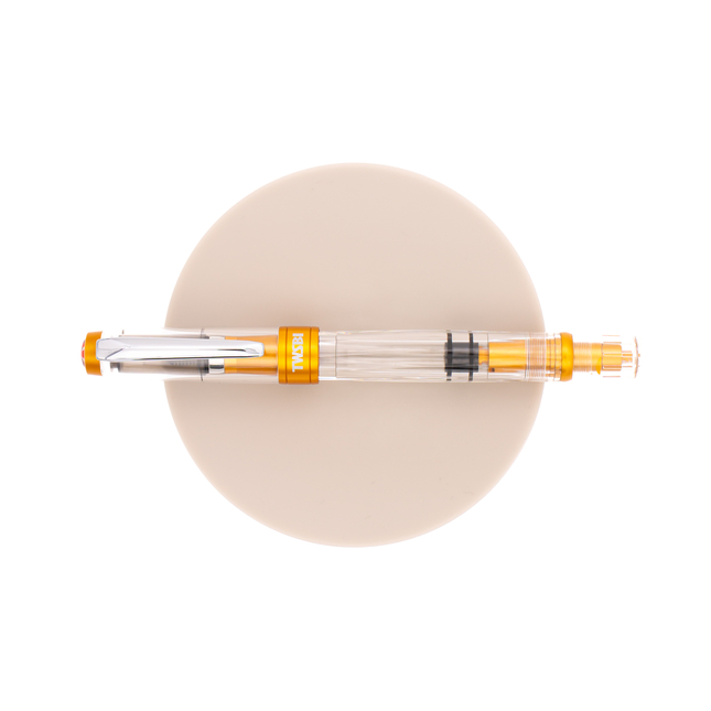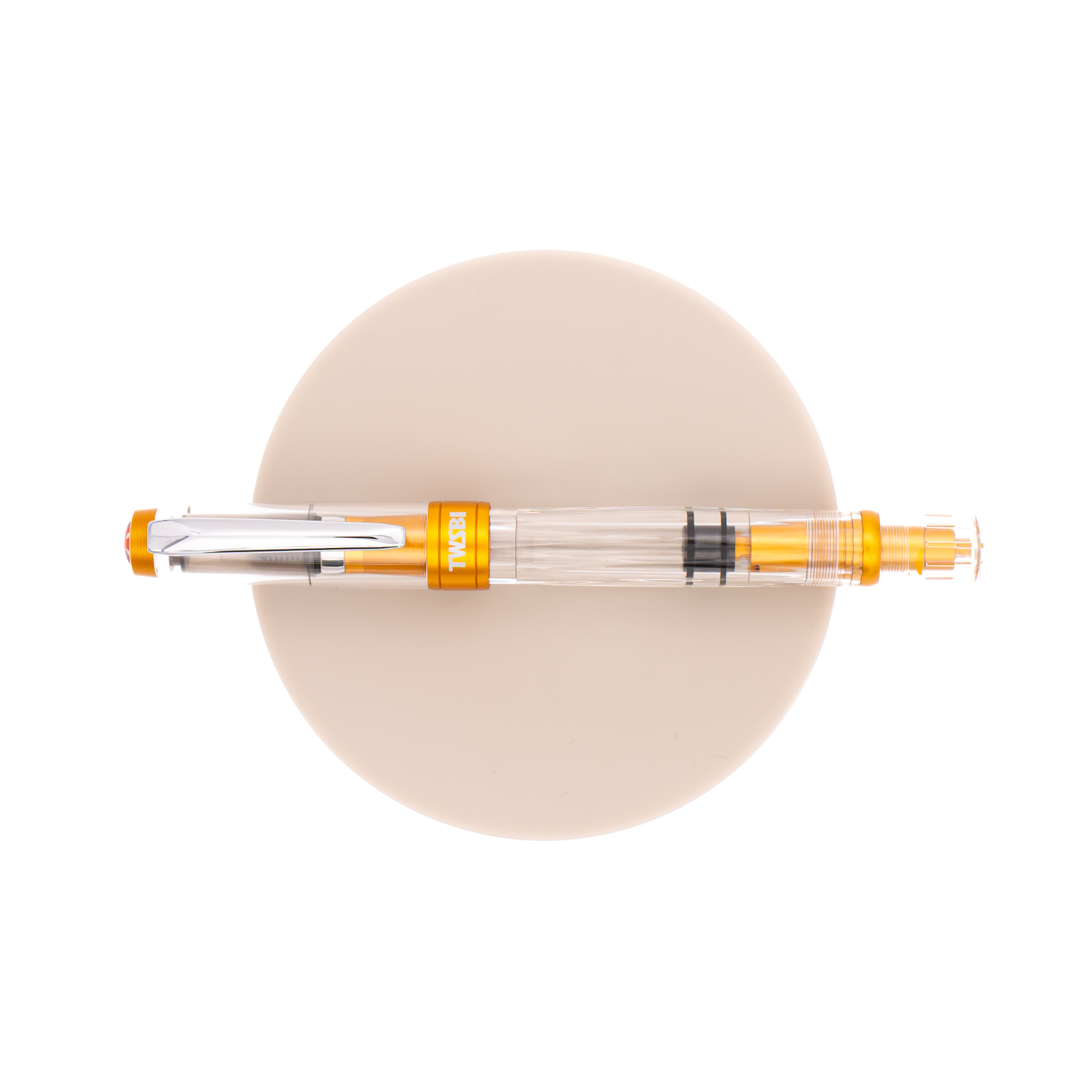 Twsbi Diamond 580 AL R Sunset Yellow is clear demonstrator fountain pen with piston, grip section and details in Sunset Yellow aluminium. AL R series comes with a circular engraved grip section for more comfort during long session writing. The demonstrator body shows how the pen works and the ink color inside.