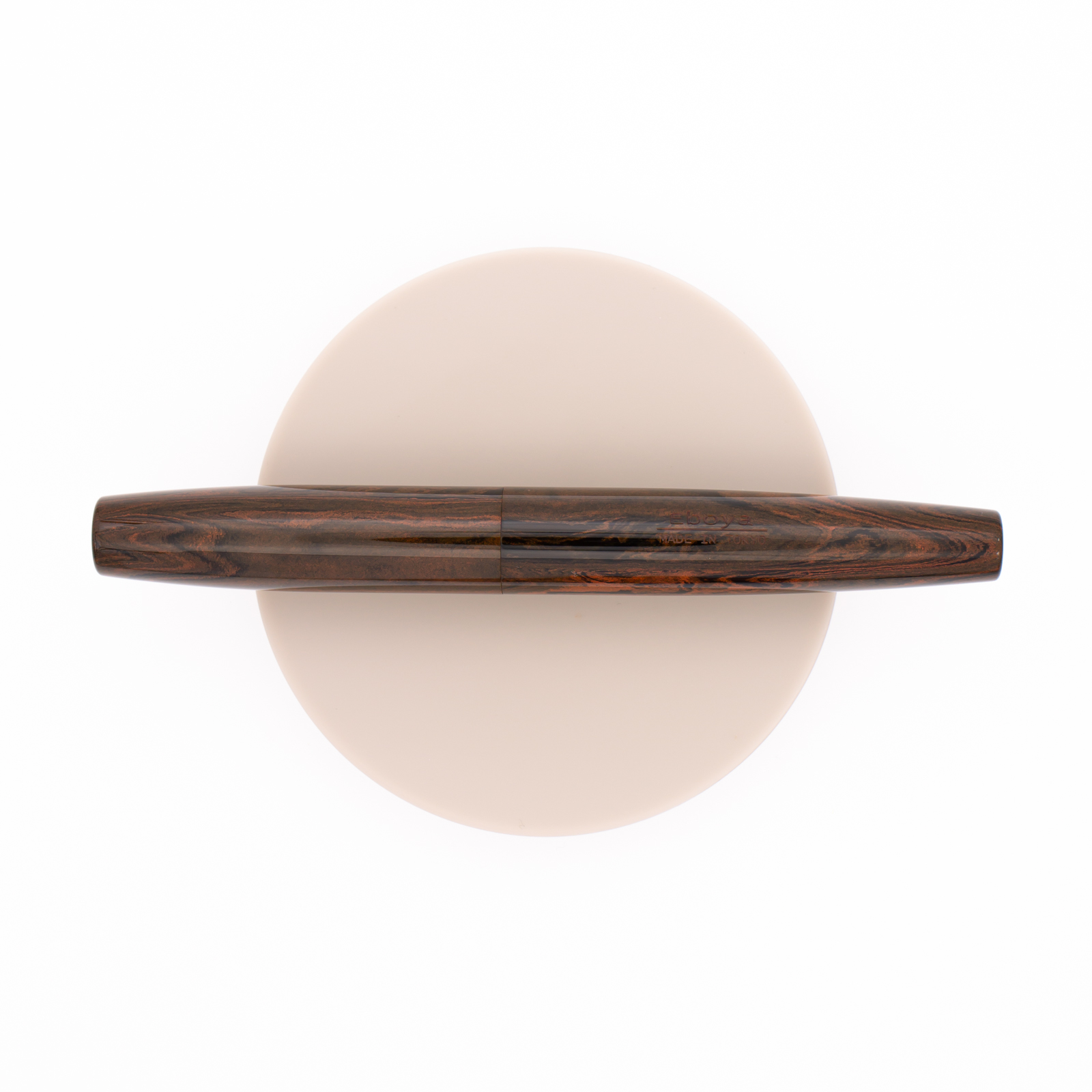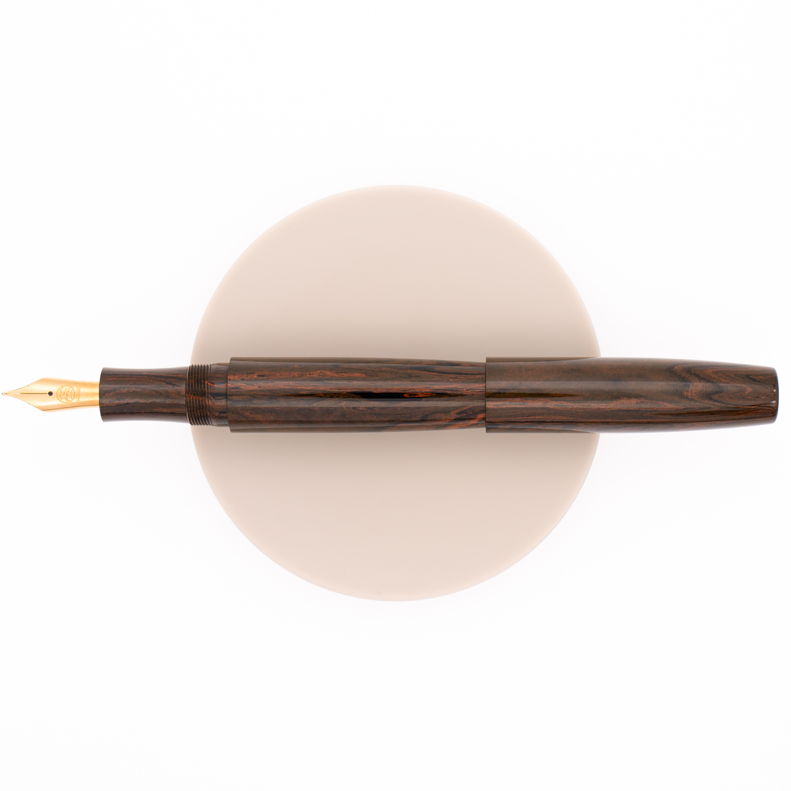 Eboya Hakobune Large Nichibo is a traditional barrel type fountain pen with no clip. It is made with an orange marble pattern on black ground ebonite to give you a warm touch and a beautiful Japanese minimalist design. 14 KT gold nib.