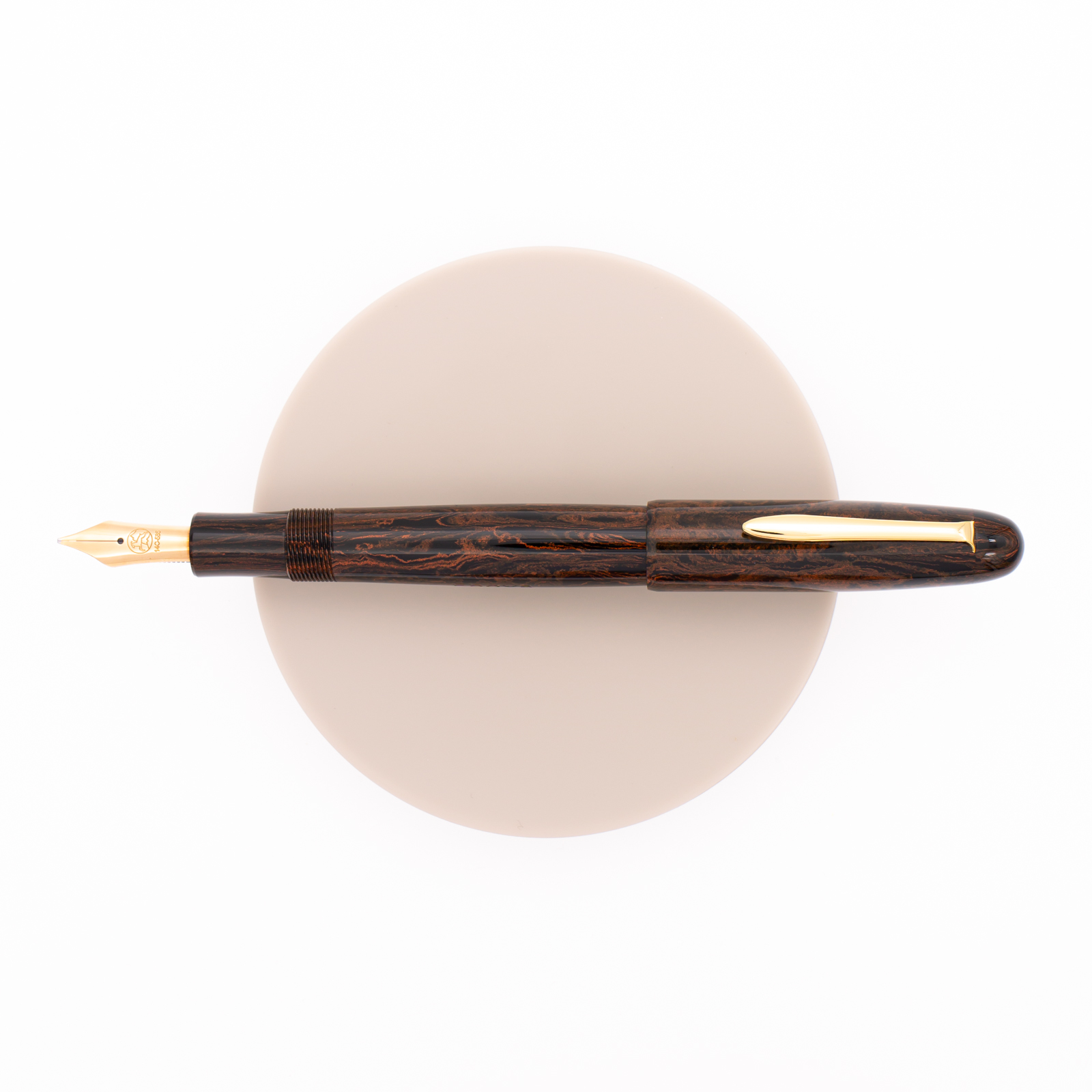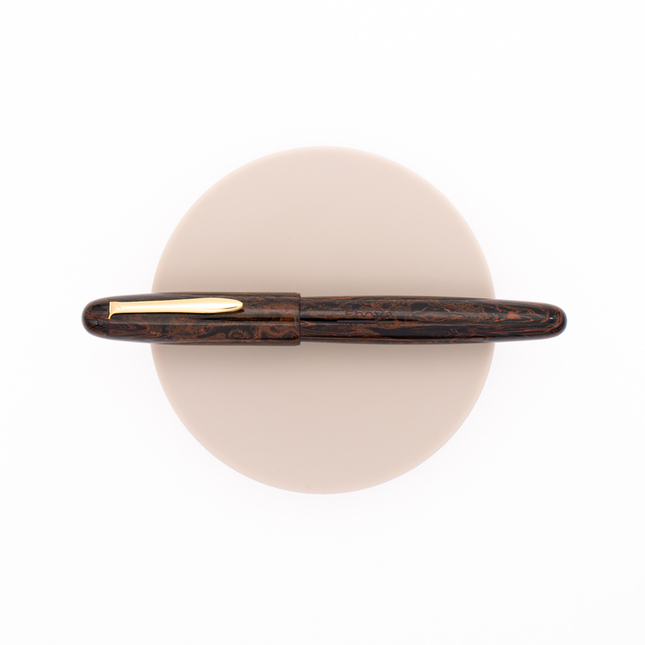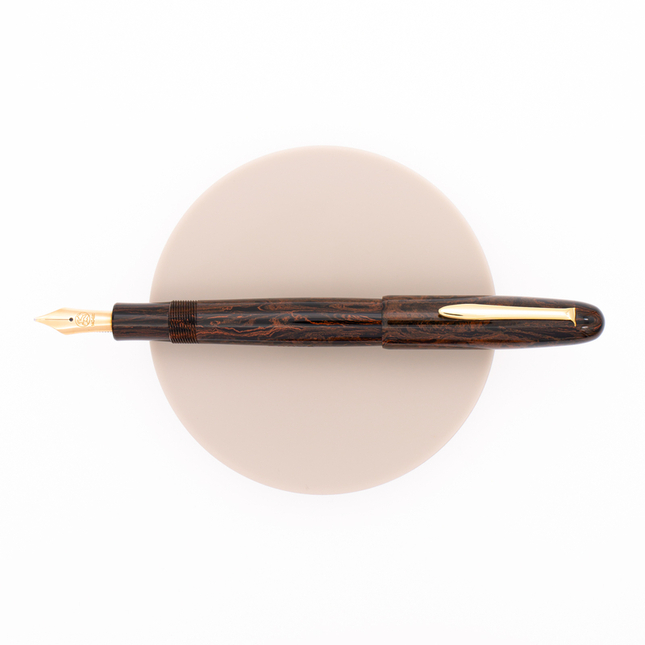 Eboya Houju Medium Nichibo is a roundish form of fountain pen with the clip. It is made with an orange marble pattern on black ground ebonite to give you a warm touch and the traditional design of this pen. 14 KT gold nib.
