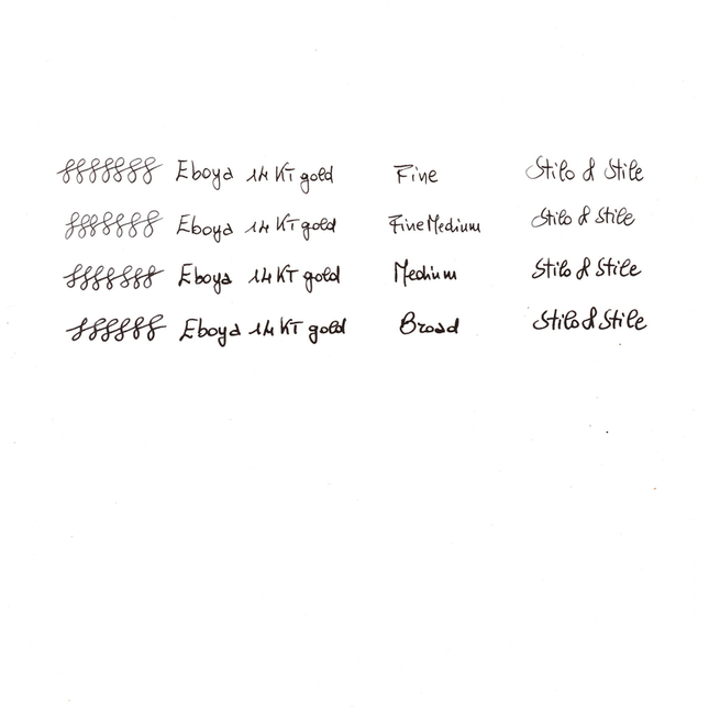 The fountain pen comes with a 14 KT gold nib and a standard international cartridge/converter filling mechanism. The pen body is engraved with the brand name Eboya and "Made in Tokyo".