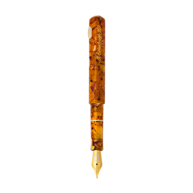 The pen’s body is made from hand-turned acrylic resin, with rich, layered textures. A gold-plated roll stop replaces the clip, adding a vintage flourish that complements the warm tones of the material.