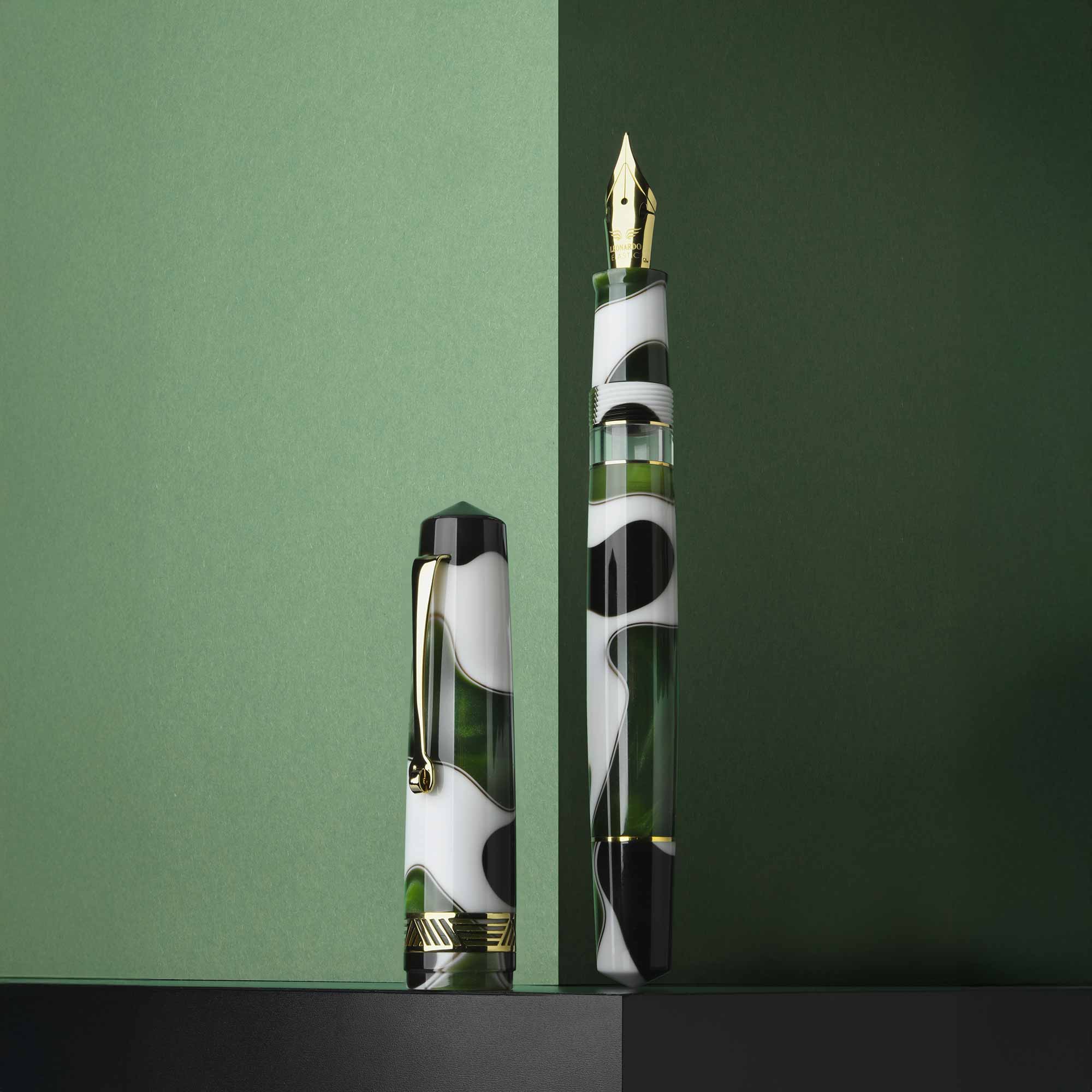 The Leonardo Momento Magico Leaf & Gold 14k fountain pen combines the natural beauty of green resin with brown veins and the brilliance of gold-plated trims for a warm and refined harmony.