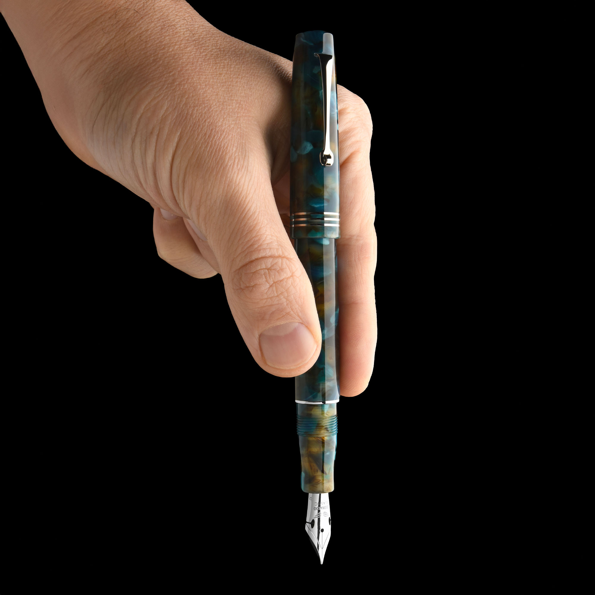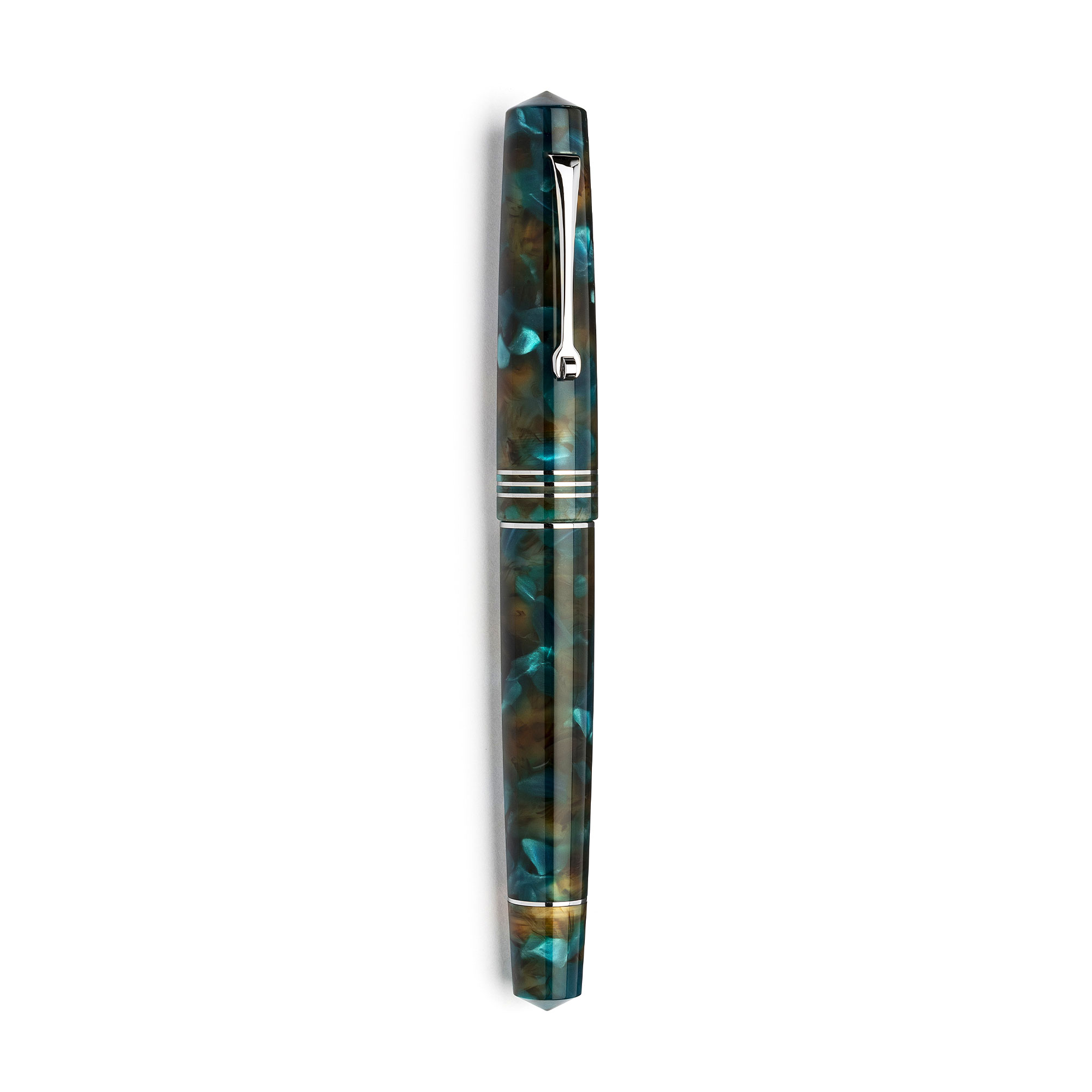 Amber and green tones meet rhodium trims and a 14k gold nib for a smooth, expressive writing experience. A refined interpretation of classic Italian fountain pen design.