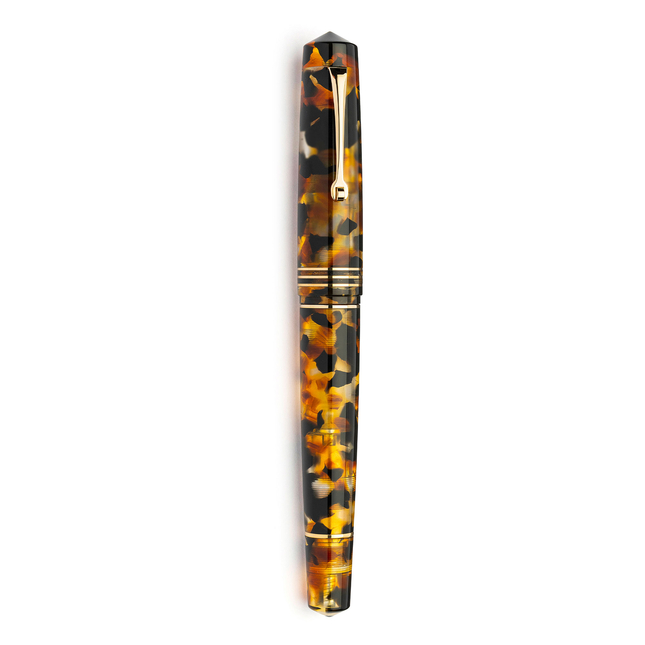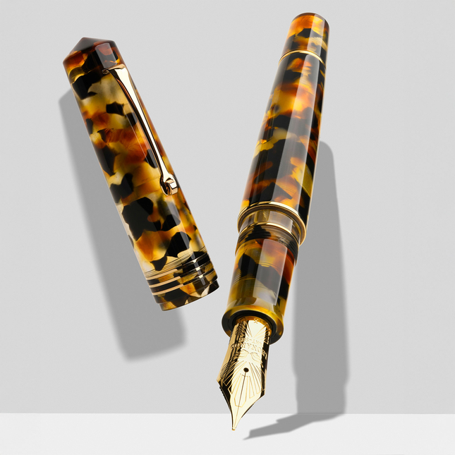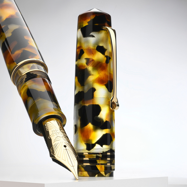 The translucent Italian resin blends amber, brown, onyx, and yellow tones—an earthy palette inspired by forest foliage and filtered sunlight. The gold-plated trim enhances the pen’s warm hues, adding a refined and luxurious finish.