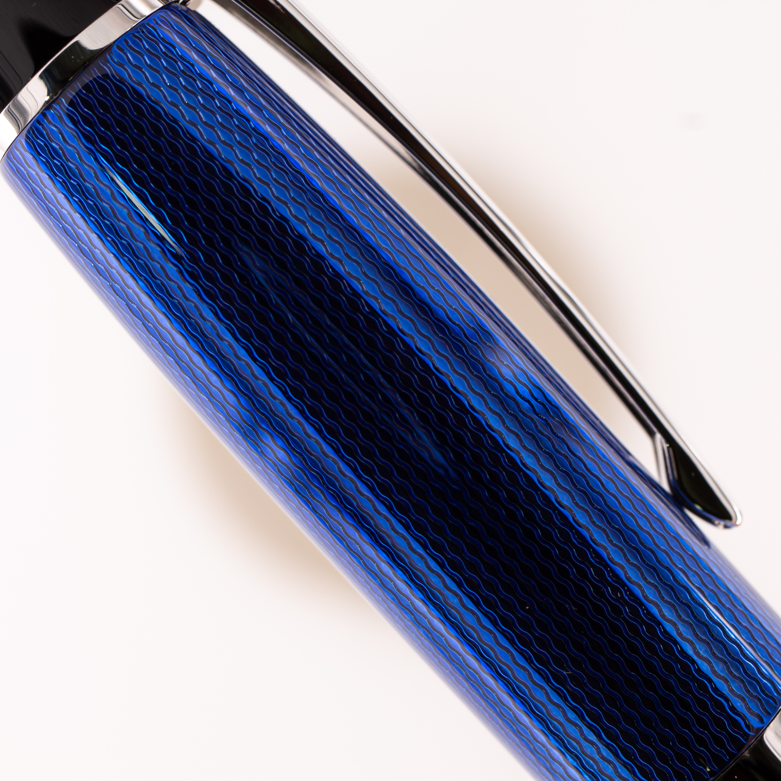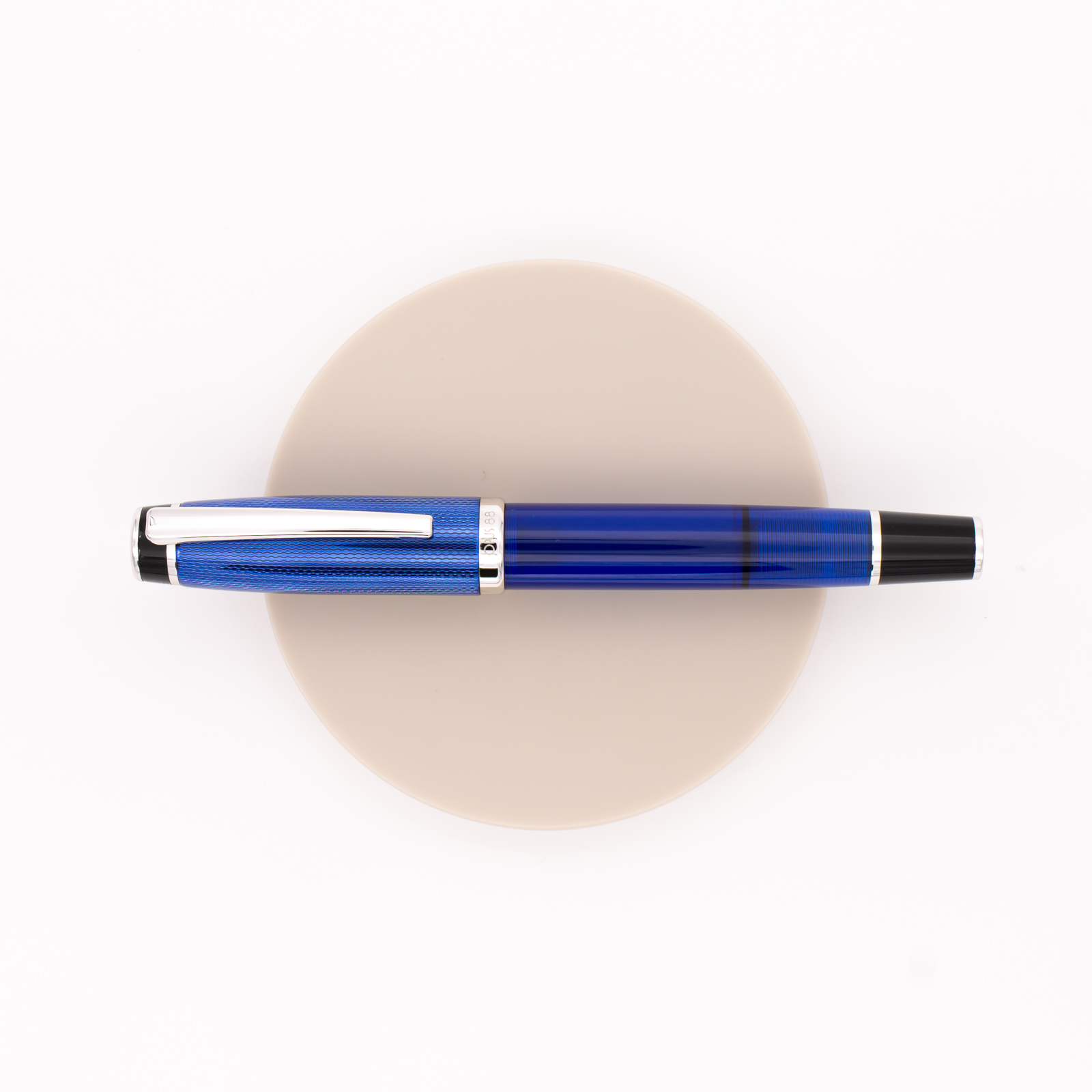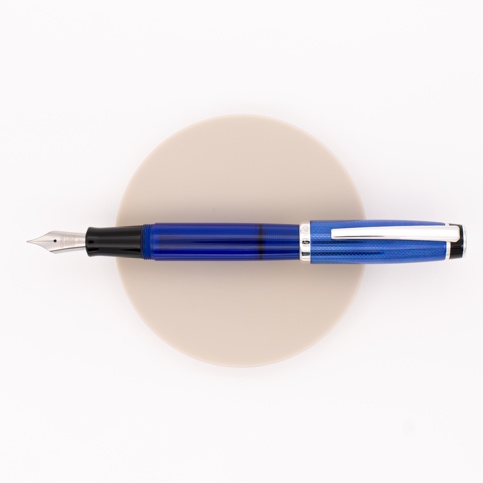Opus 88 Premium Opera Blue Dot features a transparent blue body with shiny black details and rhodium trim. No. 250 steel nib.