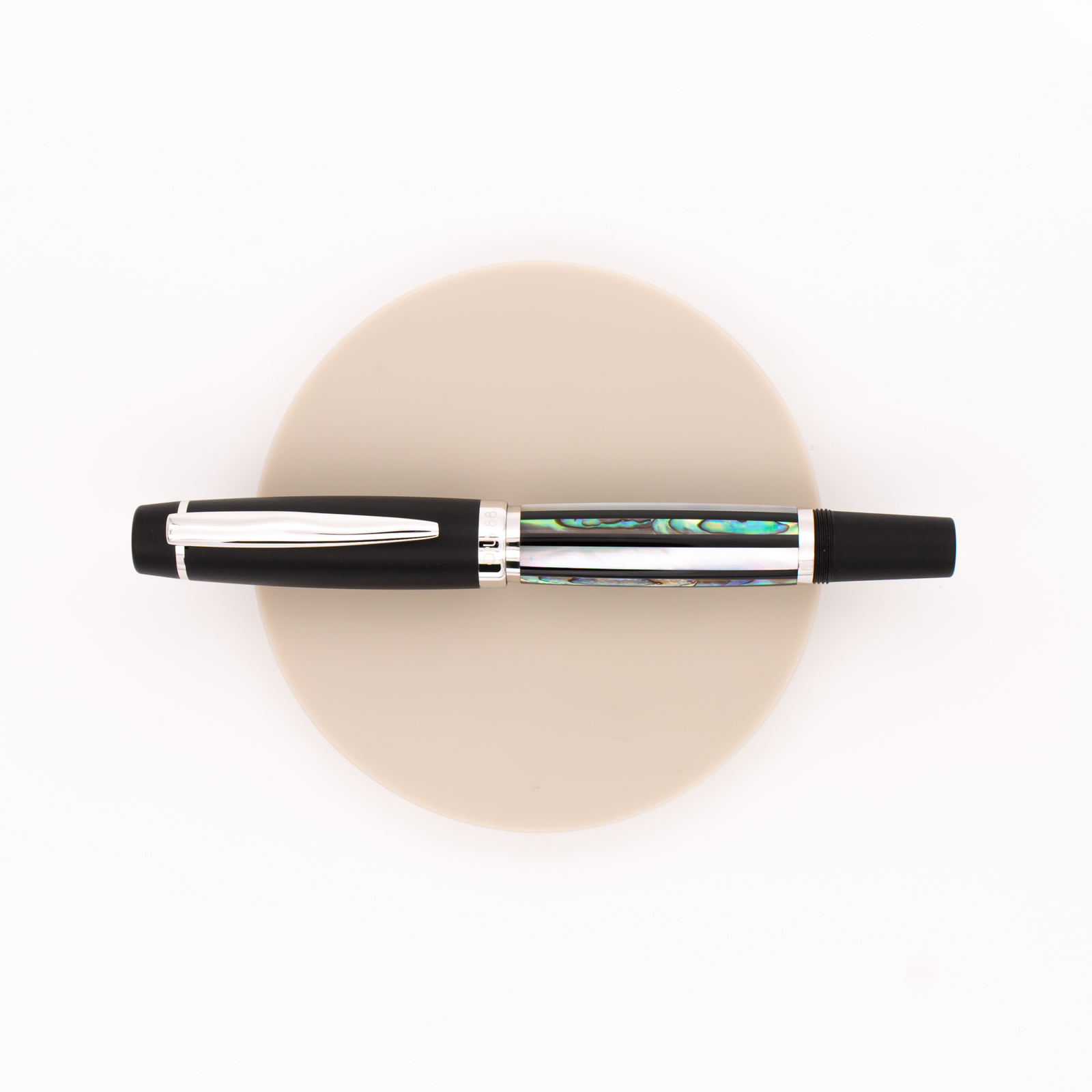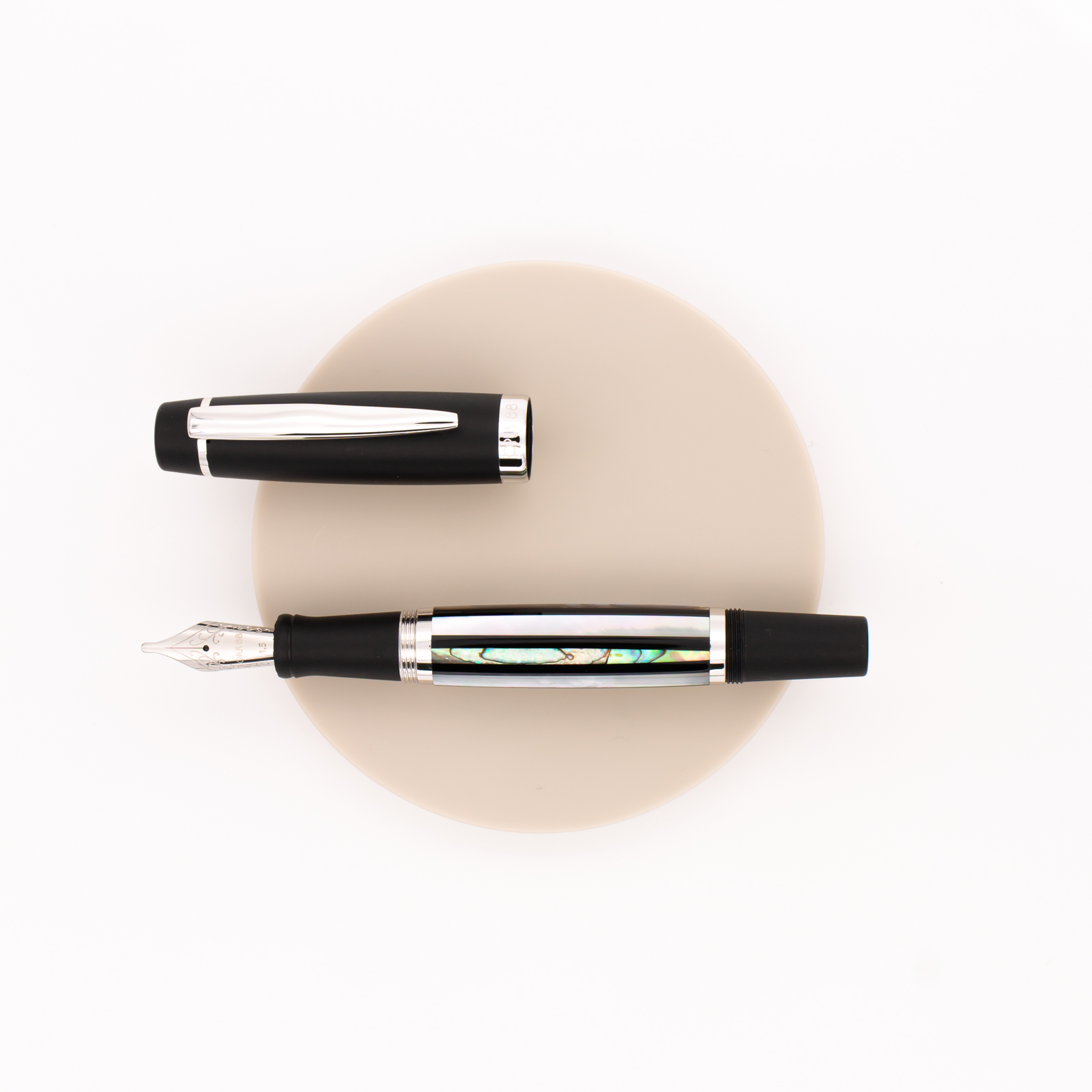 Opus 88 Premium Shell Stripe is a fountain pen made with mother of pearl and satin black resin. It accepts standard cartridge/converter to fill ink and comes with a #6 steel nib.