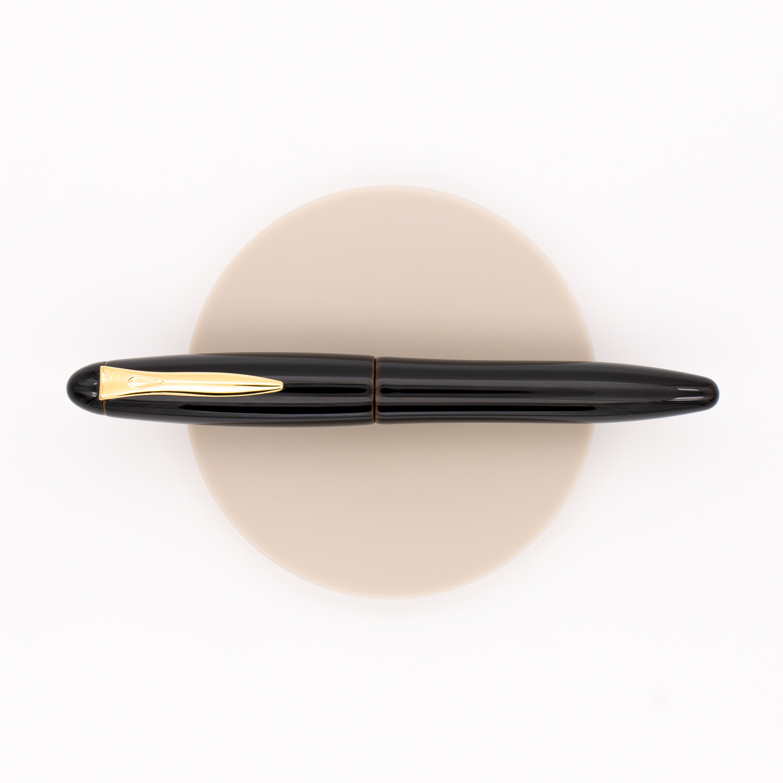 The mirror polished esthetic is due to he Urushi Tamenuri technique. A vivid beautiful urushi lacquer finish will be increased in beauty over time, you can be proud of Urushi lacquer fountain pen. The black color of ebonite and lacquer is elegantly interrupted by light brown / yellow (Biwatame) details.