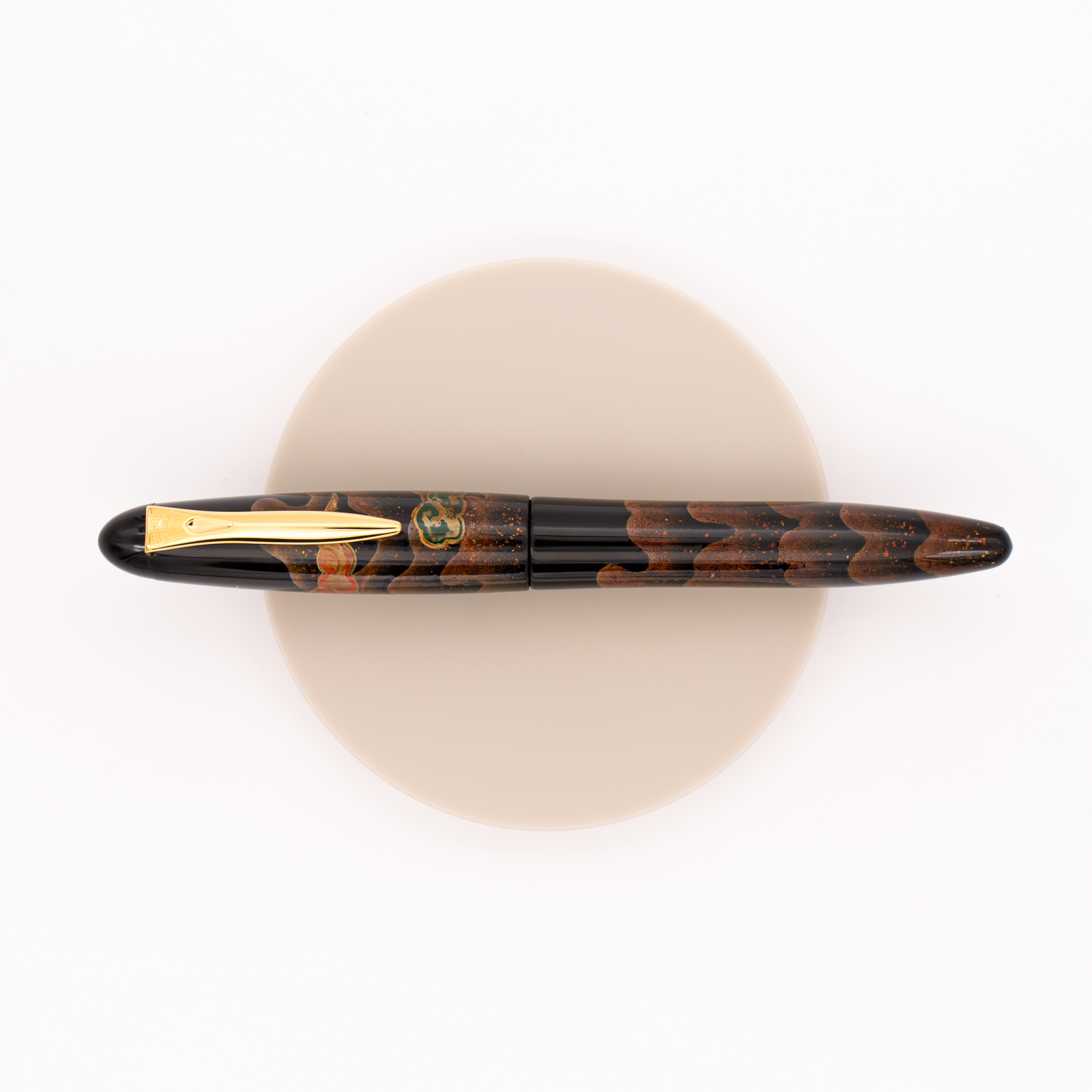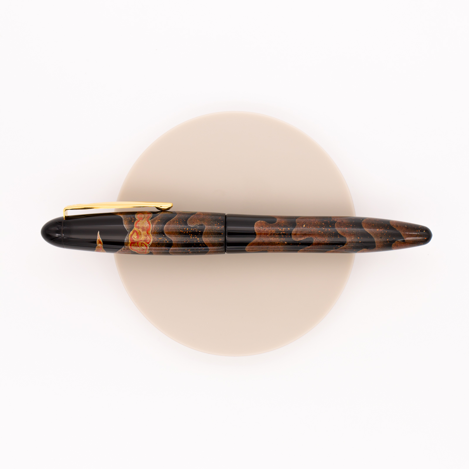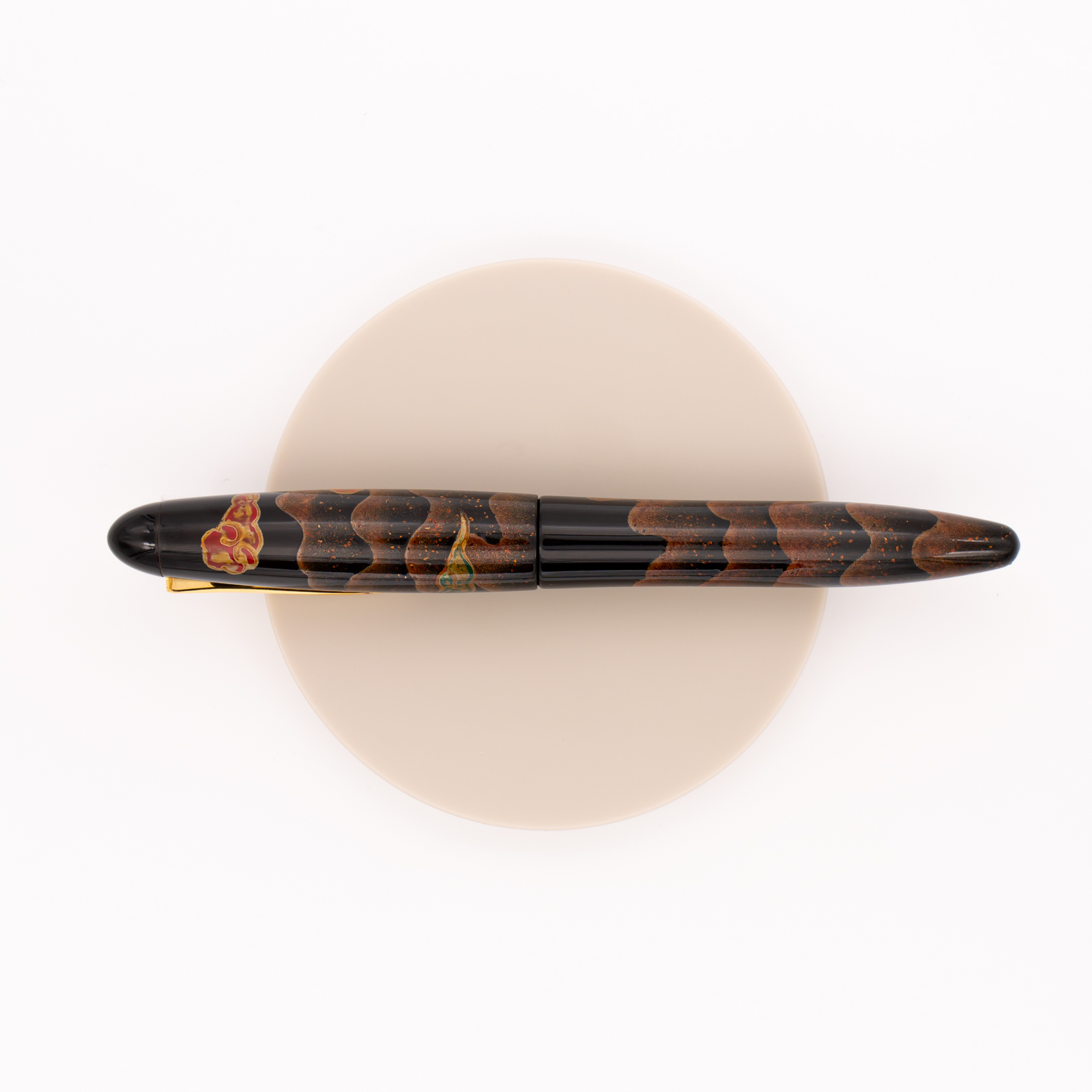 Made in ebonite, Platinum Izumo Yakumonuri Ginsen Yakumo features the floating clouds painted on the ceiling of Izumo Shrine. The sea of clouds is described brightly with colored urushi while the outlying has been drawn in silver to accentuate the design whereby the multi layers of colored urushi are brought to the surface.