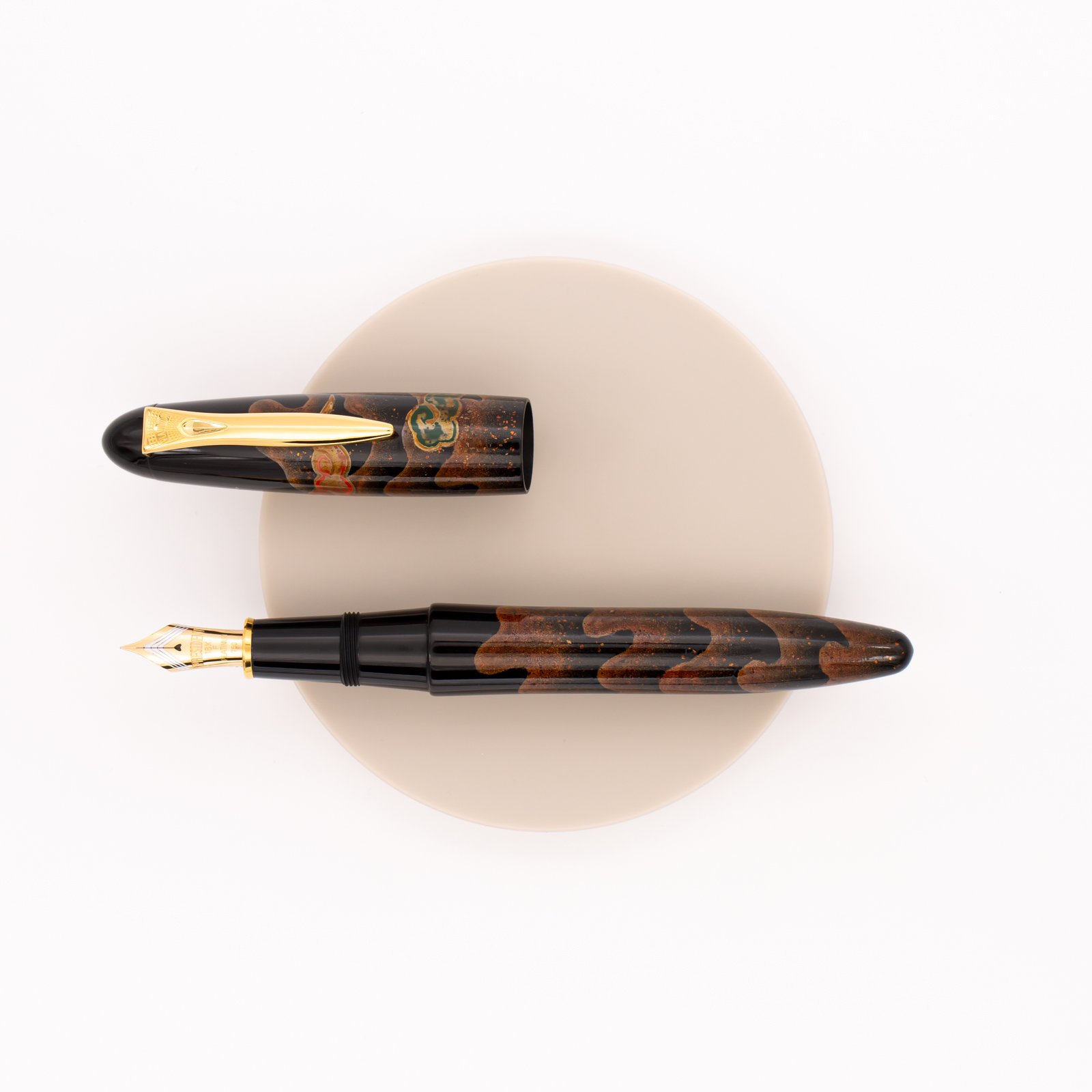 Platinum Izumo Yakumonuri Ginsen Yakumo is an ebonite fountain pen hand made by the Japanese craftsmen with numerous processes in the delicate and time-consuming art of Ginsen-Yakumo. 18 KT gold nib.