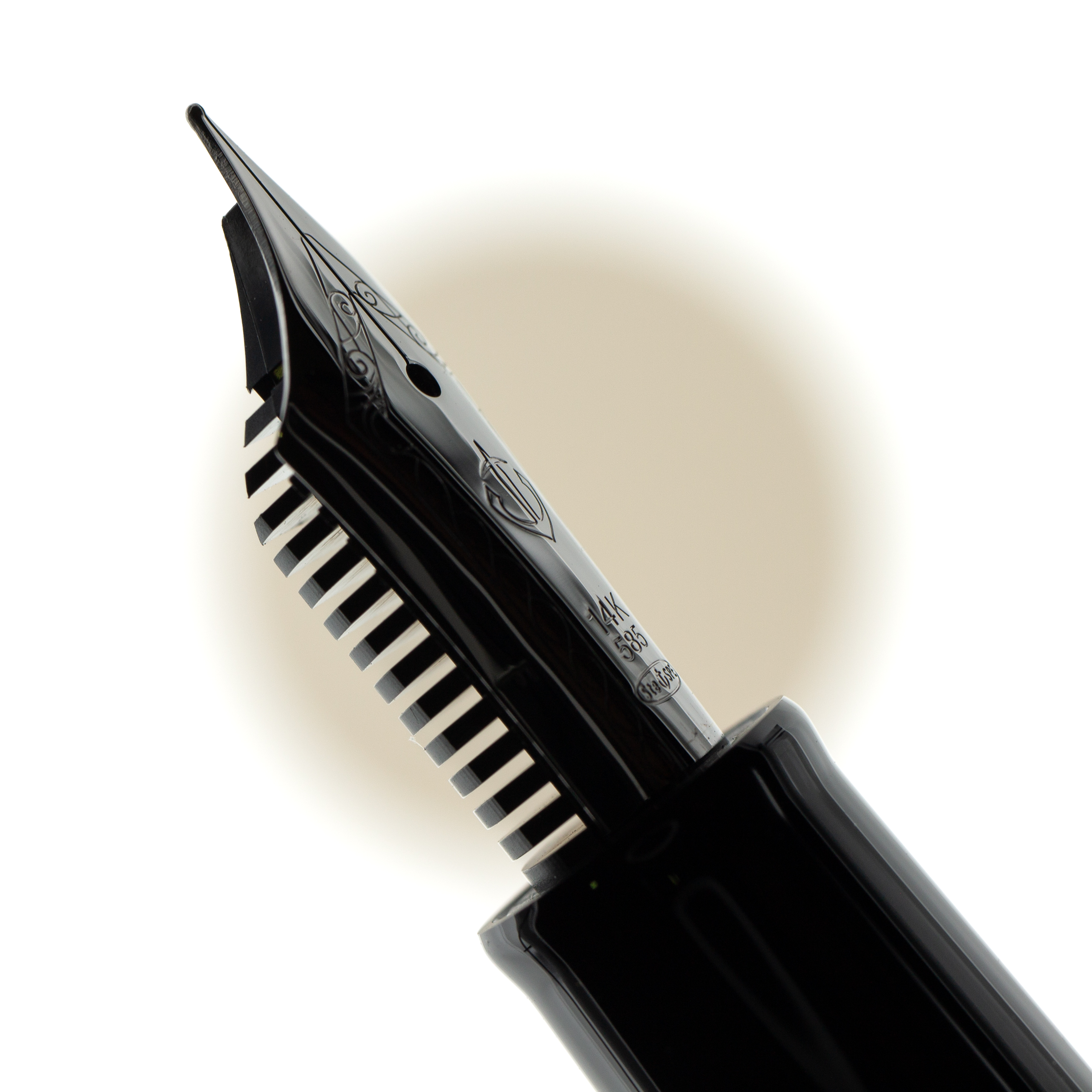 Fountain pen with Maki-e artwork inspired by the Ninja katana. Black resin body, 14k gold nib, and cartridge/converter filling system by Sailor.