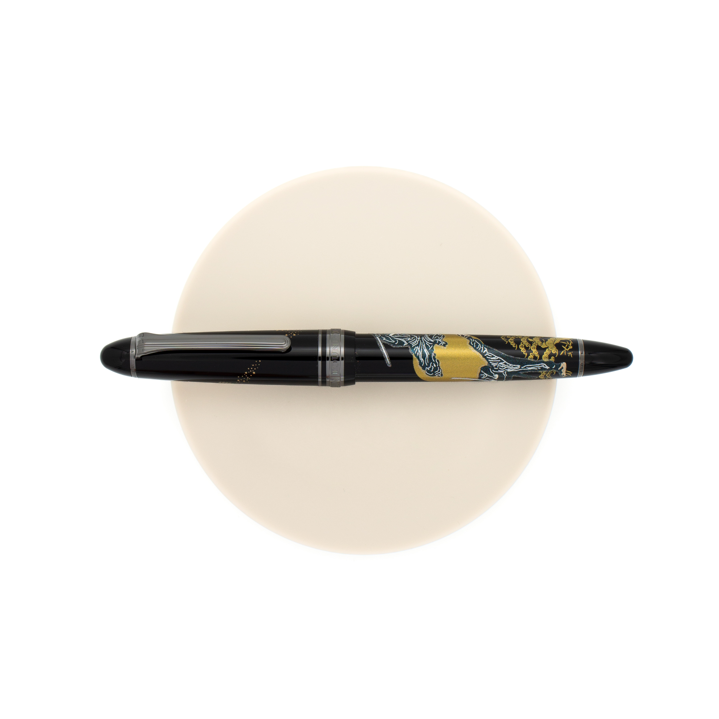 The pen features Yuubi Maki-e artwork showing a Ninja wielding his katana in motion, set against a glossy black body that evokes the stillness of the night. Gold leaf highlights bring a touch of elegance to this silent warrior’s tool.