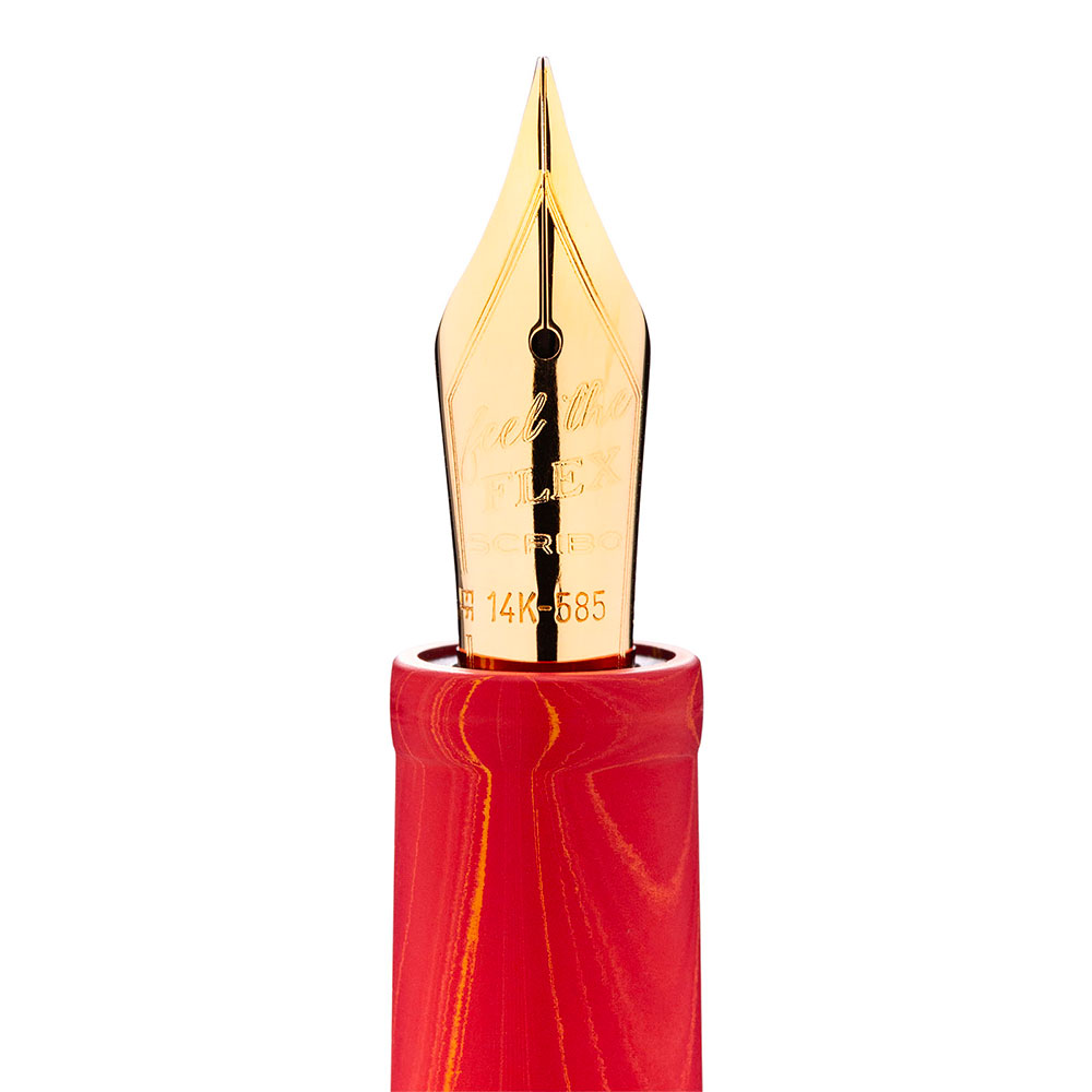 Crafted from ebonite, a living and noble material, the pen features a matte finish that offers a warm, organic feel in the hand. The Liber version is characterised by its deep red colour with yellow veins, enhanced by gold-plated trim, evoking passion, earth, and the strength of ideas shaped through writing.