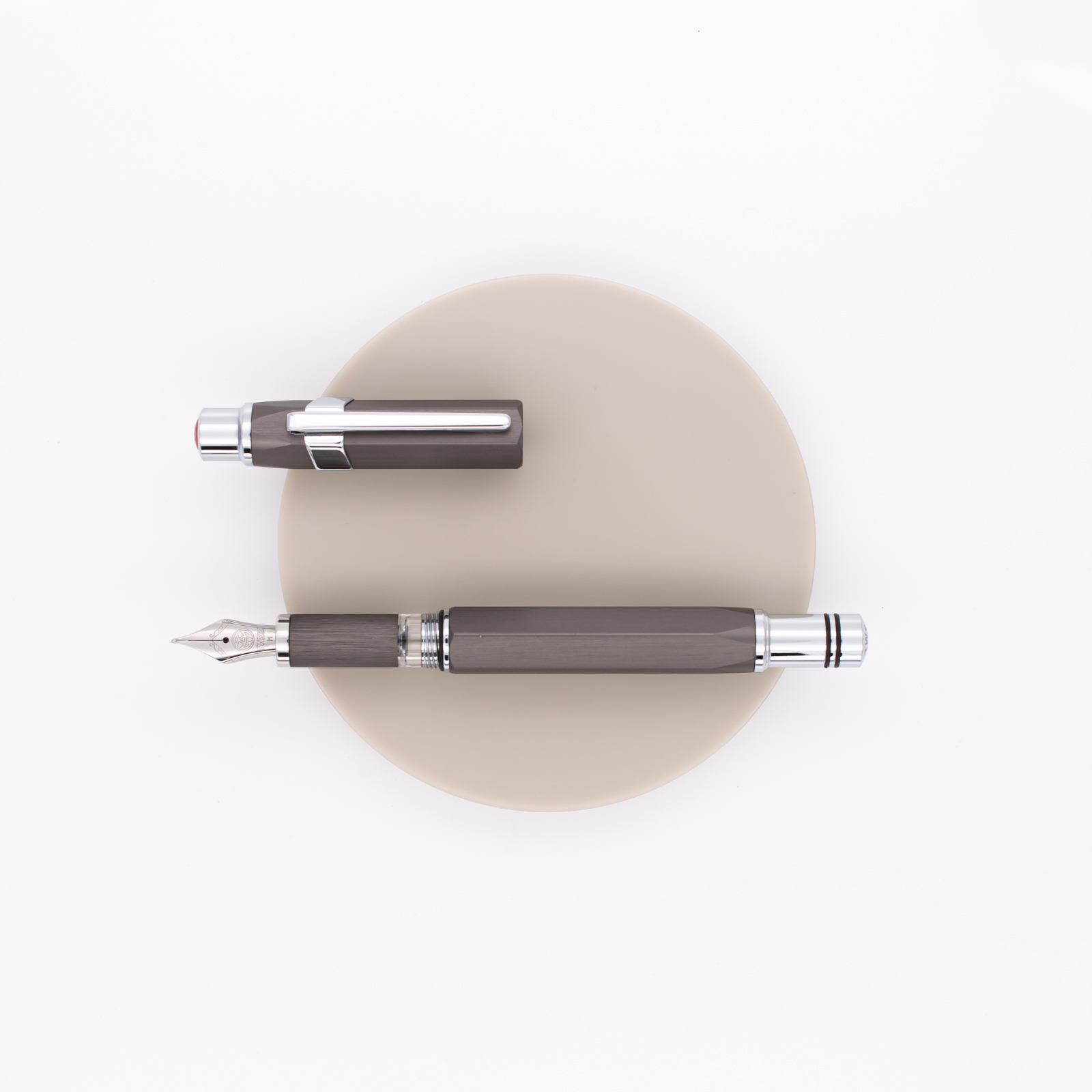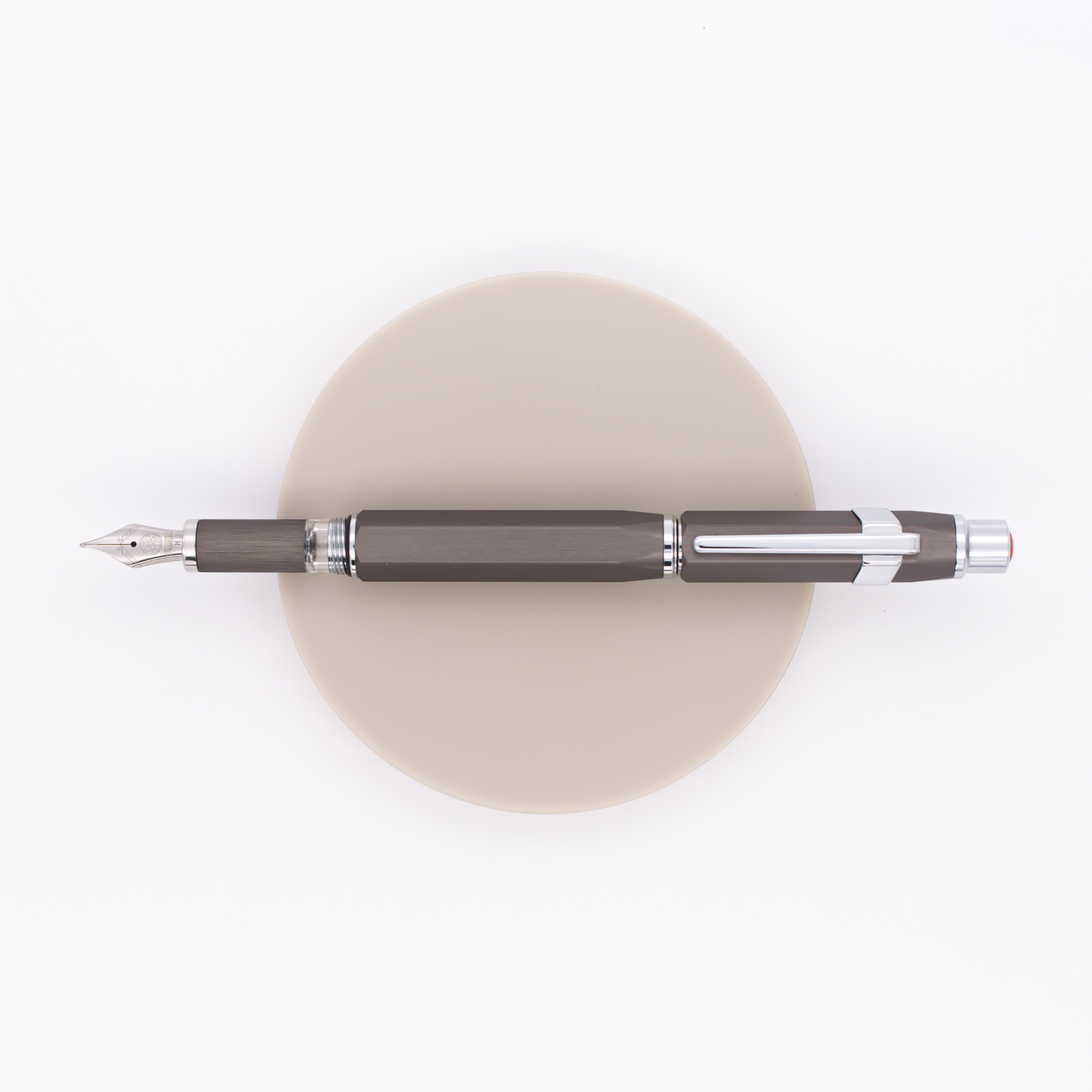 TWSBI Precision Gun Metal: modern fountain pen with an octagonal metal body and dark grey metallic finish. Piston filling system.