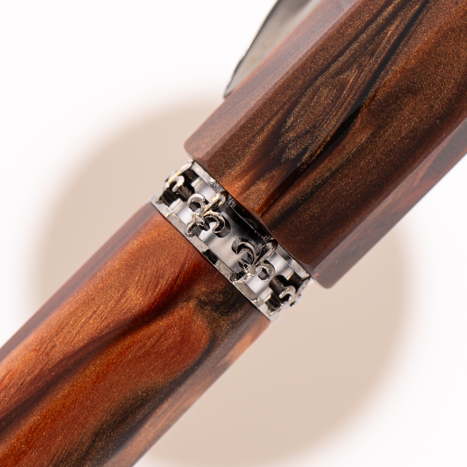 Visconti Medici Ruthenium is a homage to pays homage to this important Florentine dynasty. It is a fountain pen made of a special resin composed by acrylic and silk fibers. For a more contemporary look, this special acrylic blend has been sandblasted to achieve a fine satin finish. The design features a 8 sides with a new ink window that allows the ink level to be inspected through its refined metallic skeleton with the shape of Florentine lily.