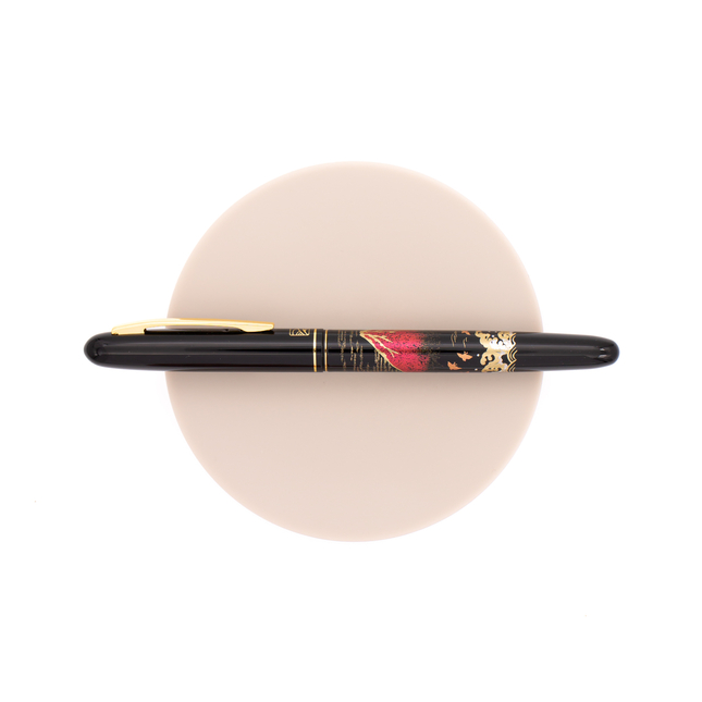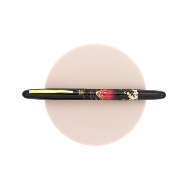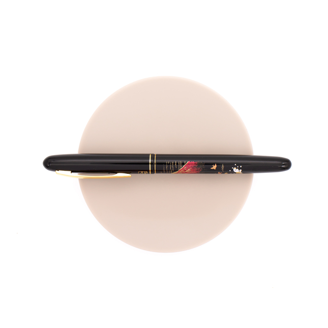 Wancher x Kuretake Kindai Maki-e Aka Fuji features a decoration with the mount fuji on a black body. It is is equipped with a steel nib and fills ink via standard cartridge/converter.
