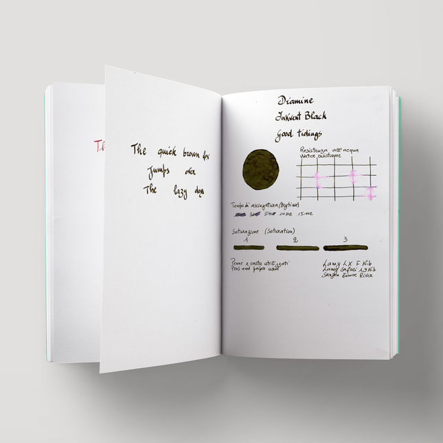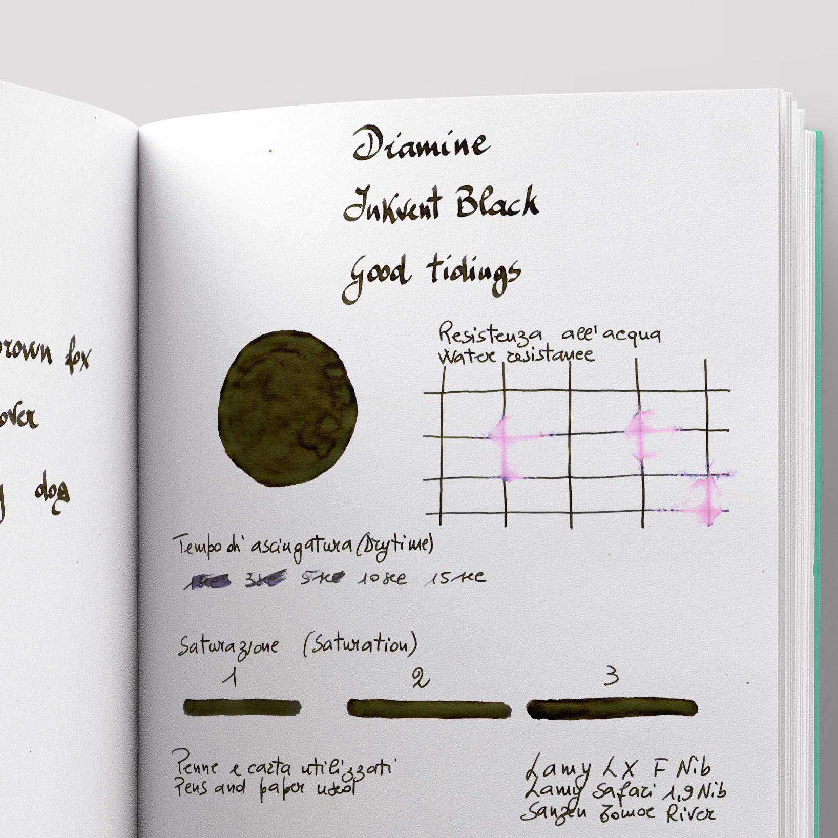 Diamine Good Tidings is a fountain pen ink from the InkVent Black Edition 2024, known for its rich and mysterious tone.