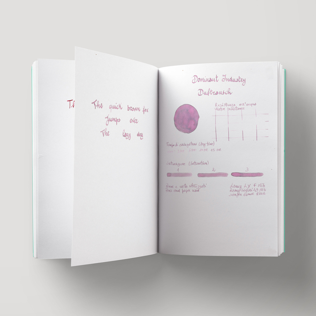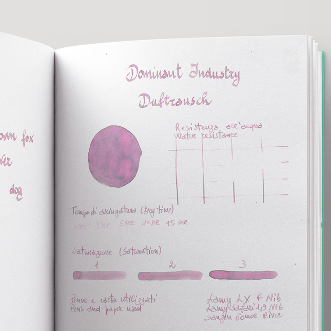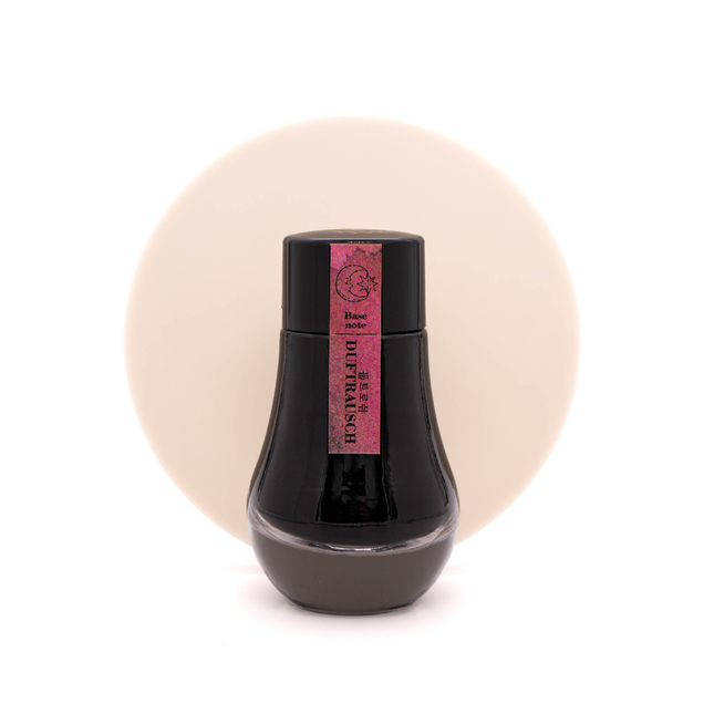 Dominant Industry Premium Duftrausch is a scented fountain pen ink. It comes in a glass bottle of 25 ml with a dust bag and a small pipette.