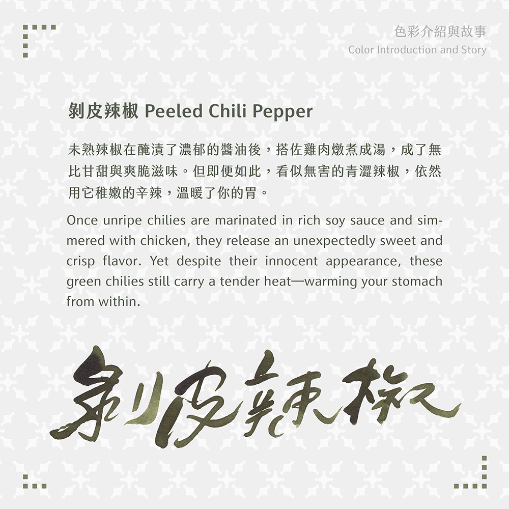 Peeled Chili Pepper is inspired by a traditional Taiwanese dish made with green chilies peeled and marinated in soy sauce. Sweet, aromatic, and only mildly spicy, it warms from within. This balance is reflected in the color, lively yet gentle, combining freshness with depth.