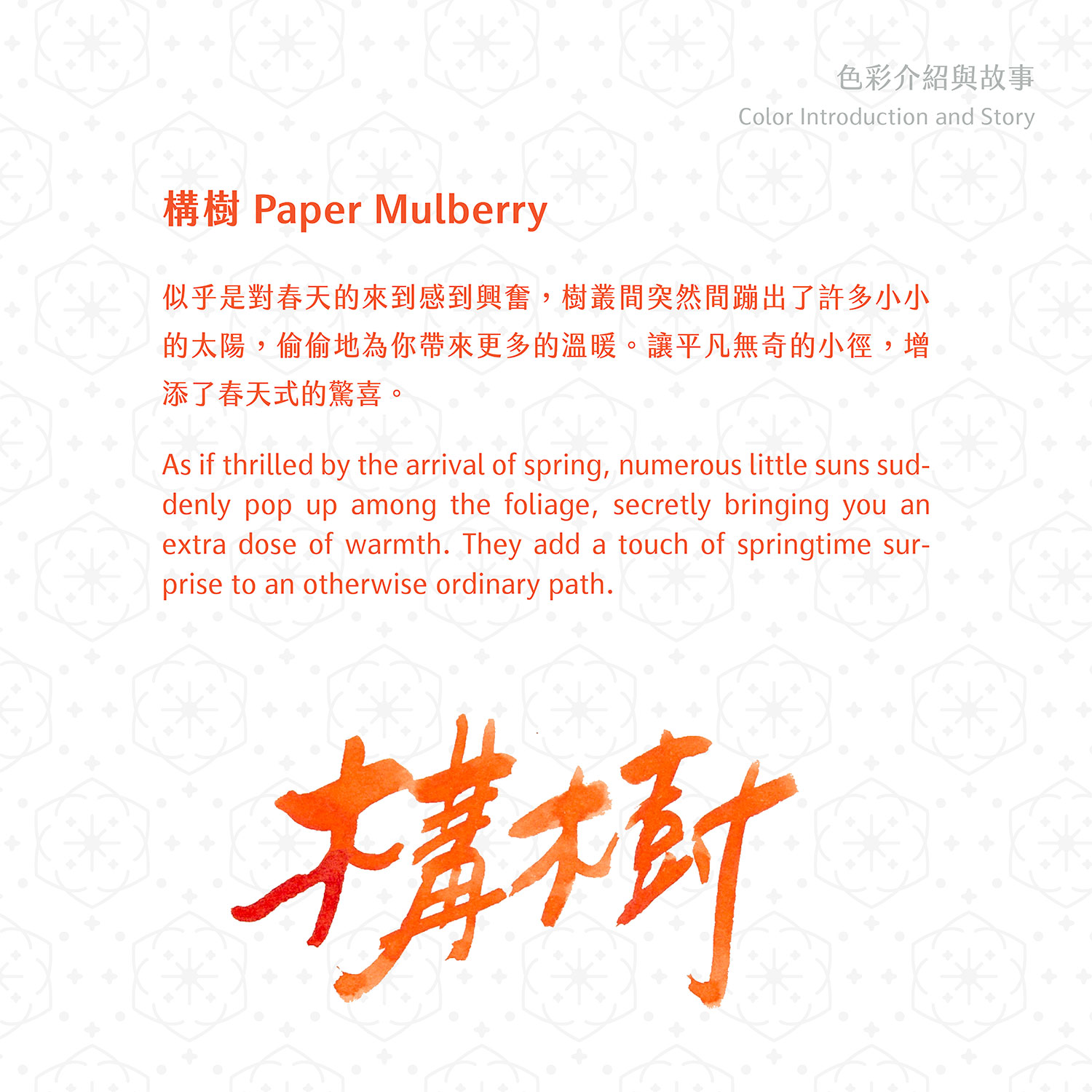 Lennon Tool Bar Paper Mulberry is a fountain pen ink from the Spring Limited 2026 collection, inspired by small sun-like flowers. A warm and vibrant orange that brings light and energy to the page.