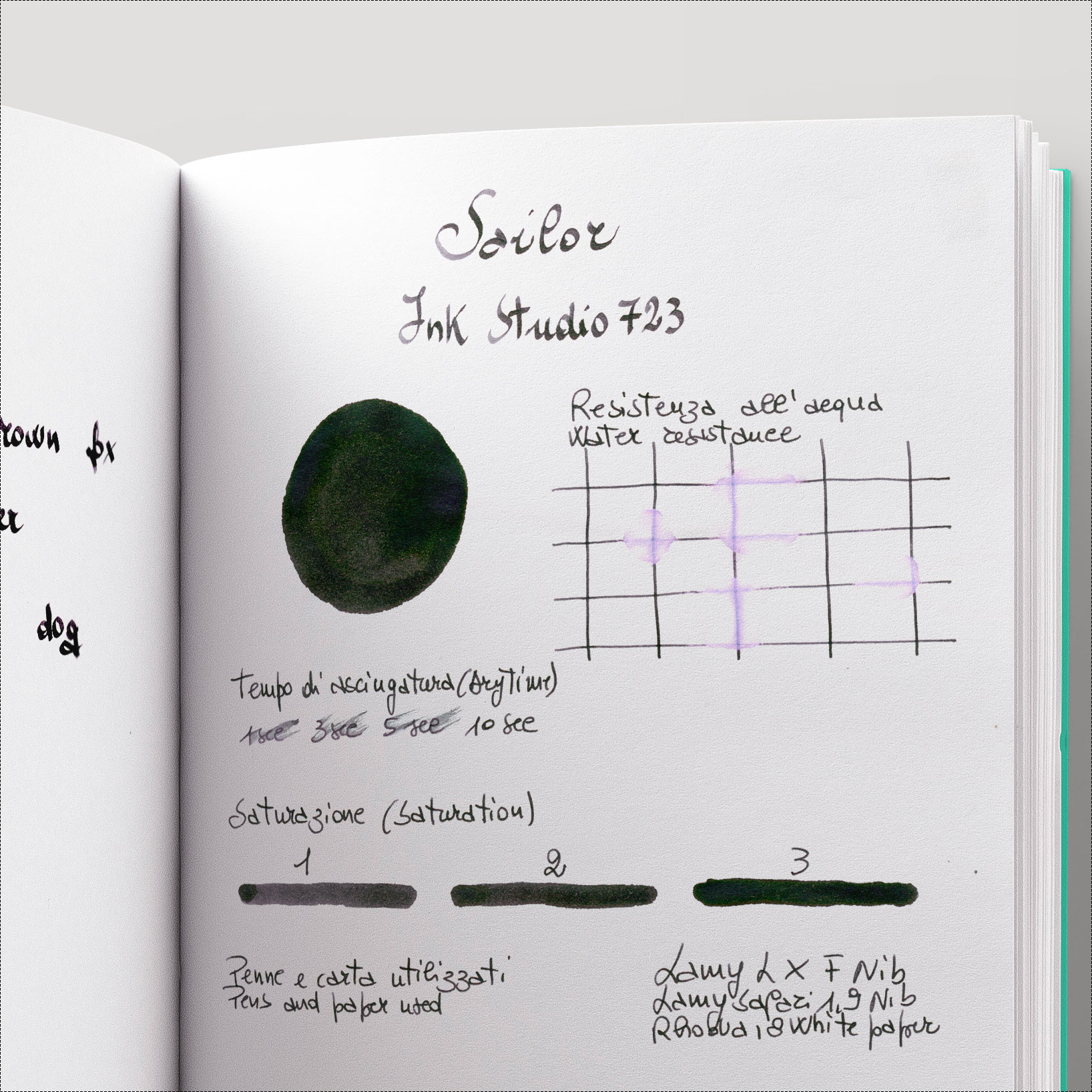 Sailor Ink Studio 723 is a black fountain pen ink and comes in a pack that contains a 20 ml glass bottle and a set of stickers that you can put on your converter to see which color you are using.