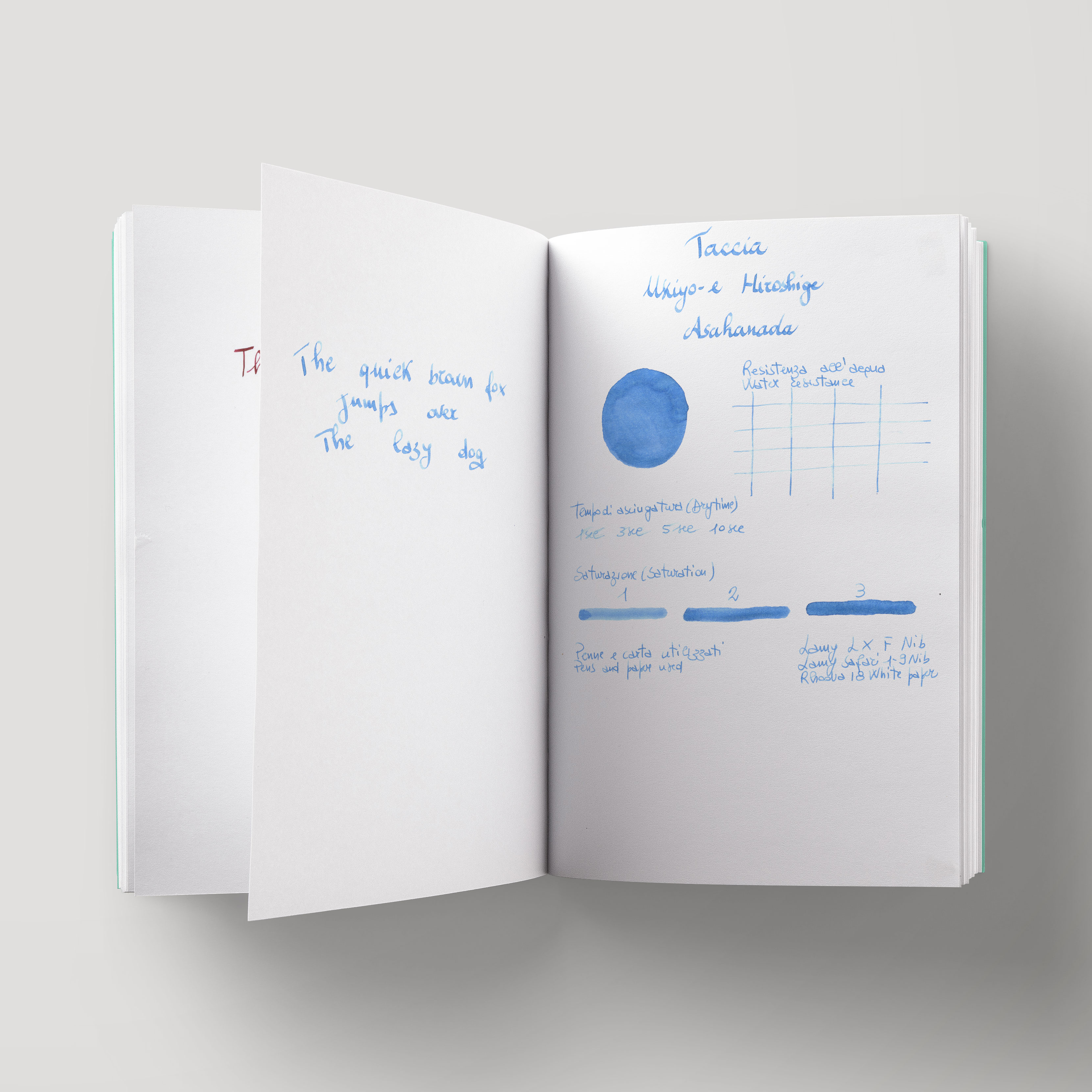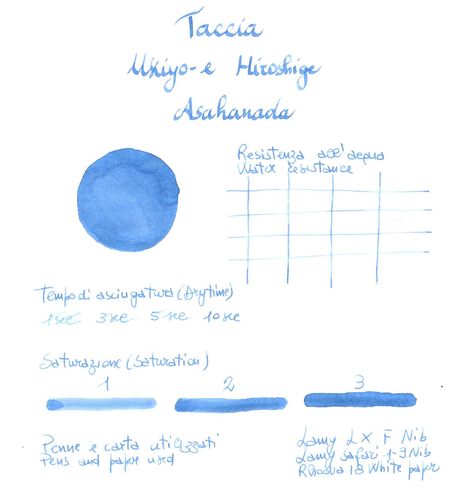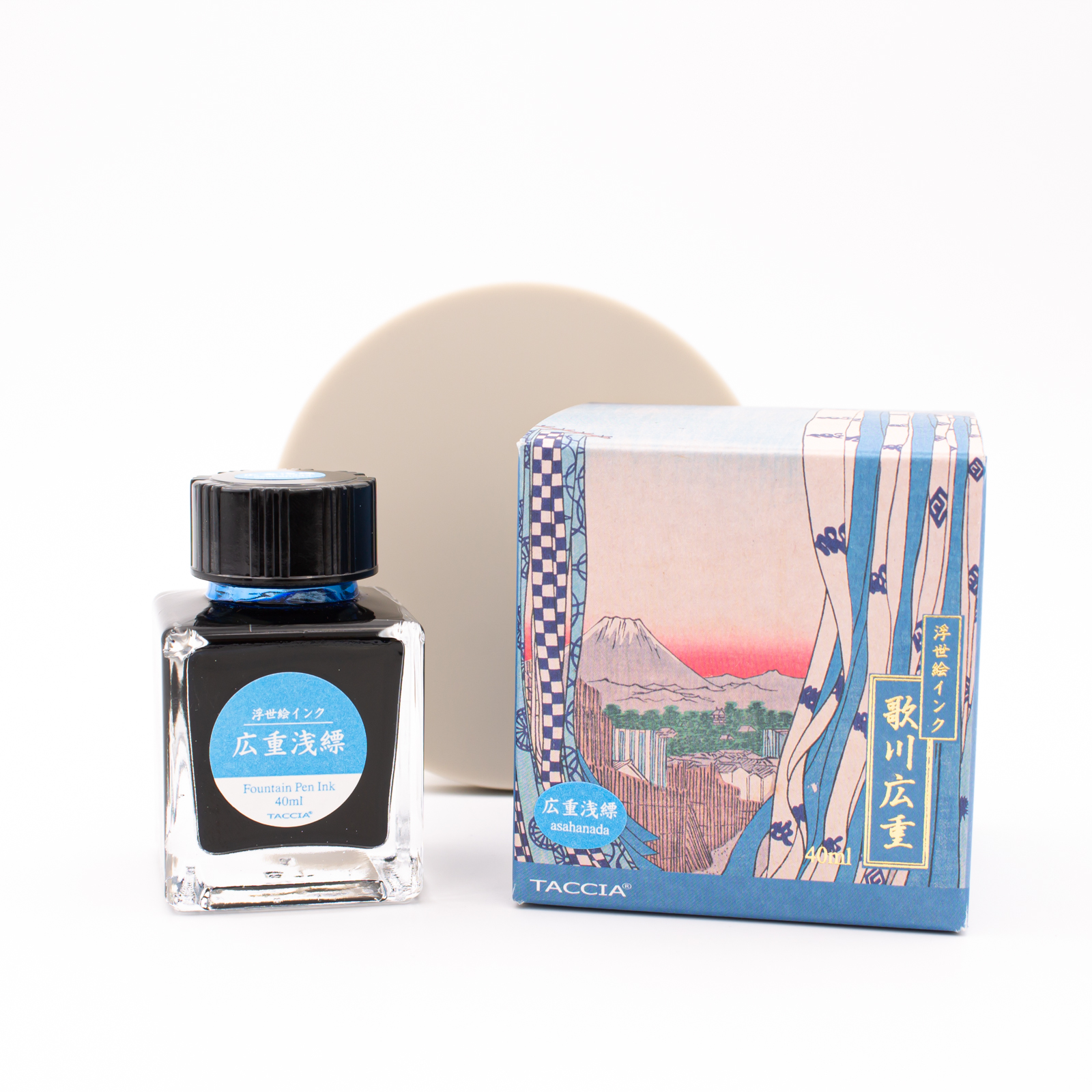 Taccia Ukiyo-e is a line of fountain pen ink with different colors inspired by traditional Japanese paintings. Asahanada is a light blue from Hiroshige opera "Kanda Kon'ya-cho" that is reproduced on packaging.