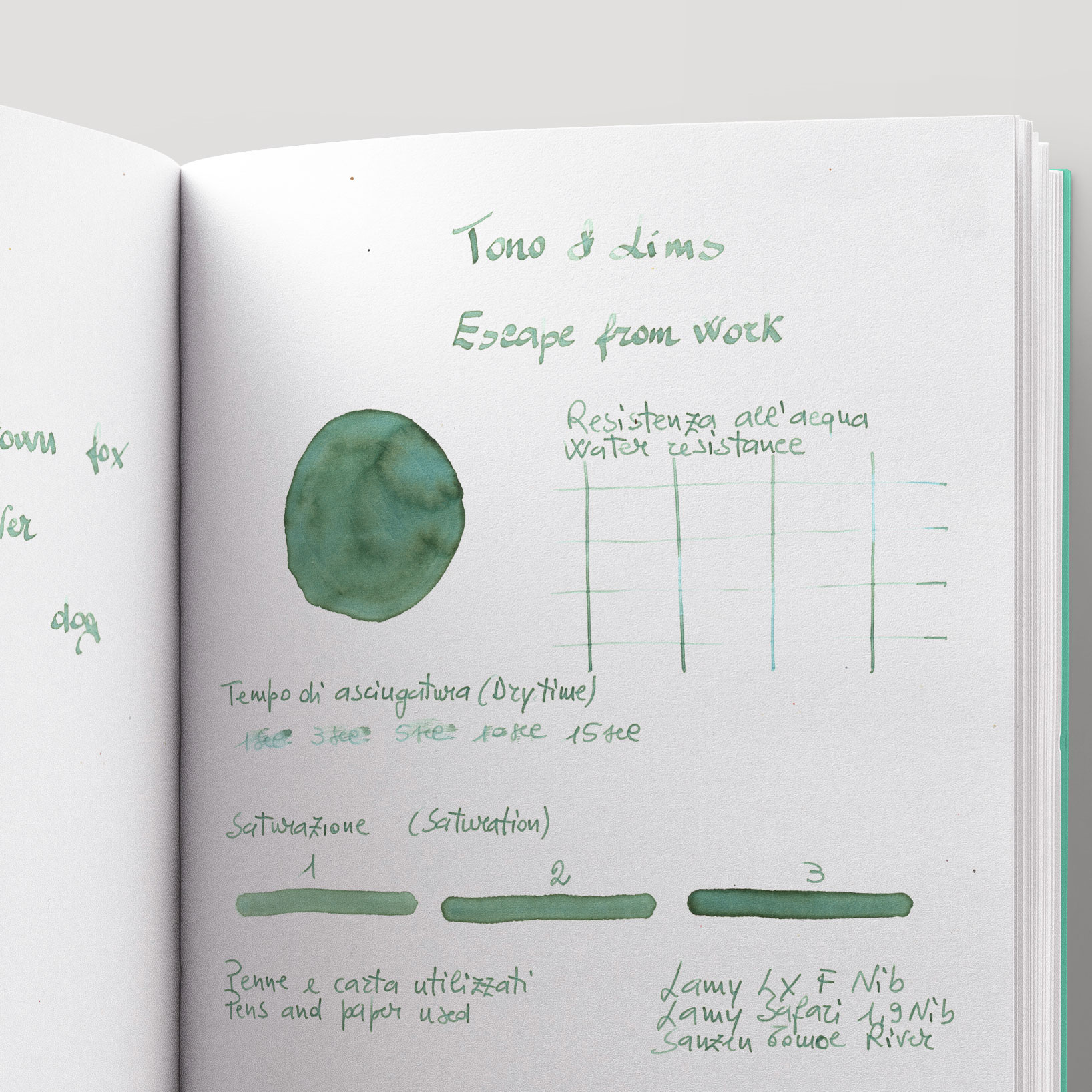 Tono & Lims Escape from Work is a 30 ml fountain pen ink from the Friendship Collection. A soft green shade (RGB 147, 169, 151) with a fresh and balanced character.
