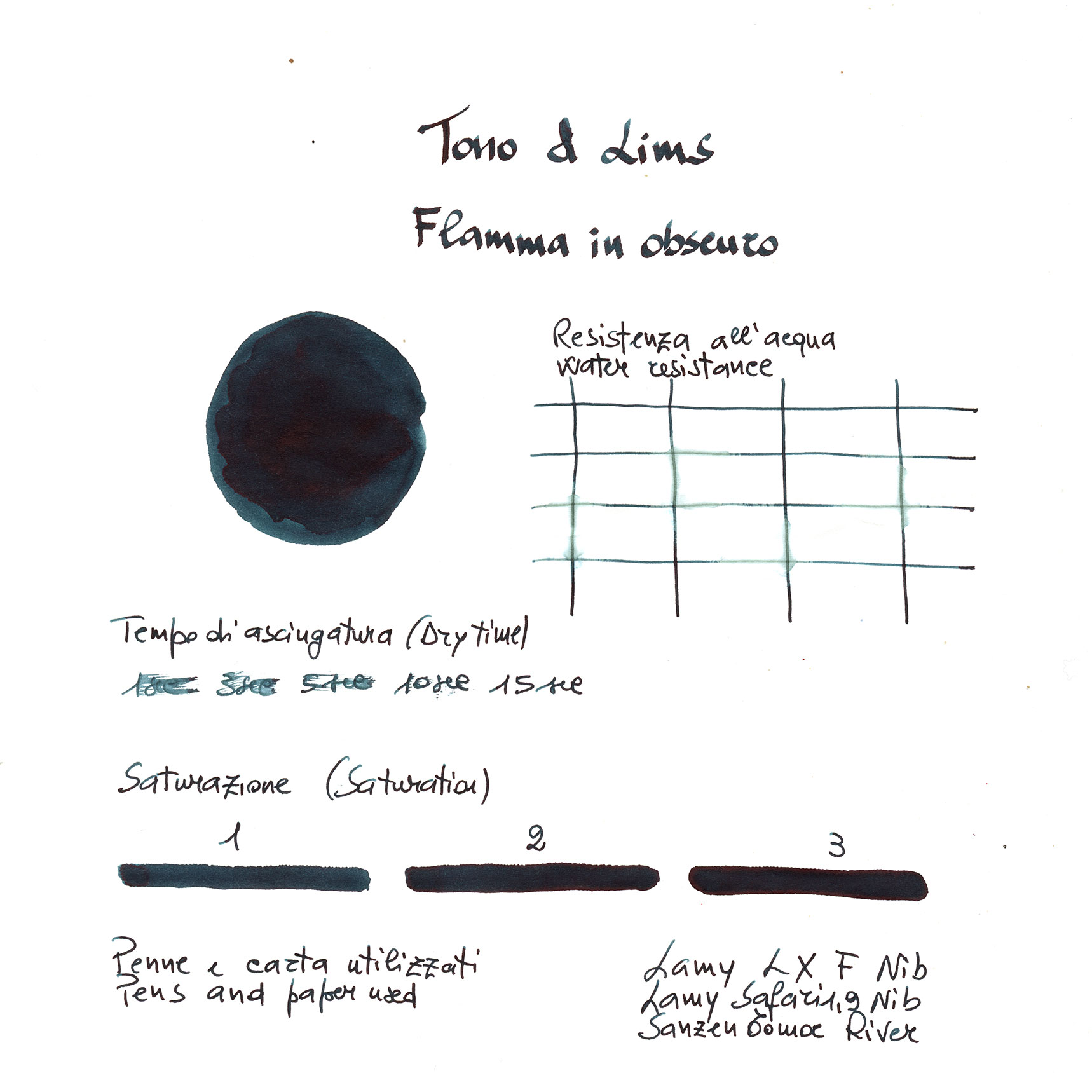 Tono & Lims Flamma in Obscuro is a 30 ml water-based fountain pen ink from the Friendship Collection. A deep teal shade (RGB 45, 93, 105) with an elegant and contemporary character.