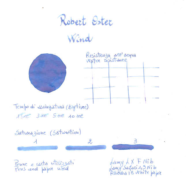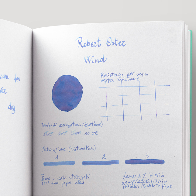 Robert Oster Wind is the color of the blue of the sky that wafts fluffy pastel clouds in milky pinkish-blue wind. It is a standard fountain pen ink and comes in a bottle of 50 ml.
