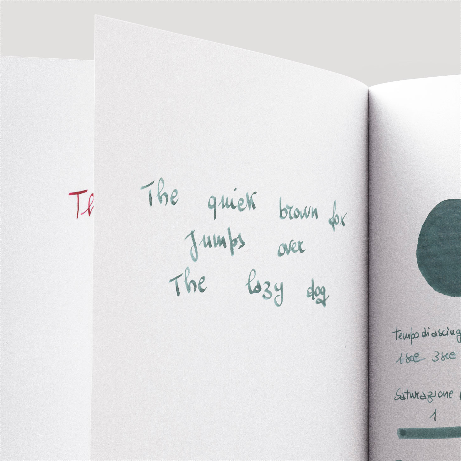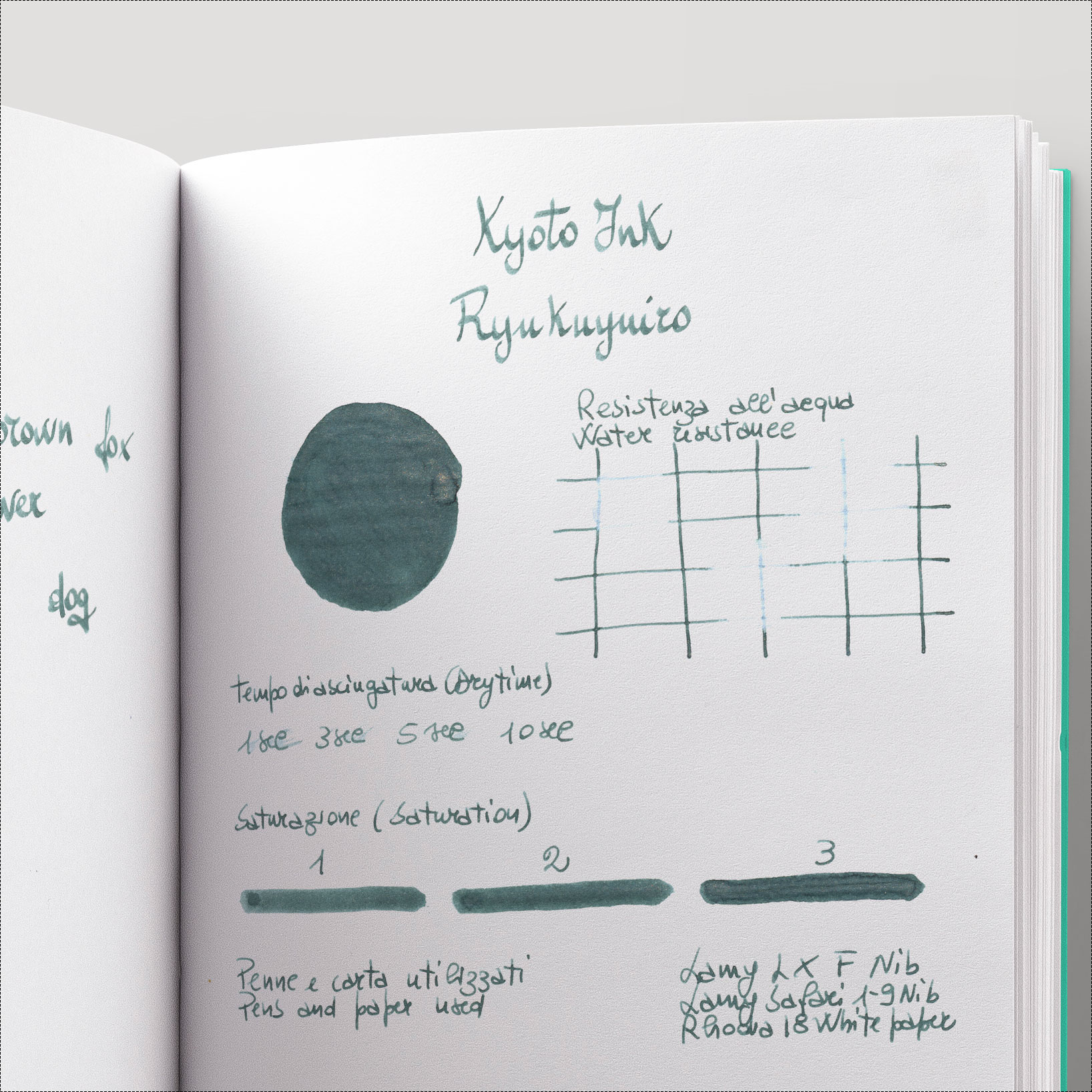 Kyo No Oto N.12 Ryokuyuiro is a dark green fountain pen ink with shimmering in silver.