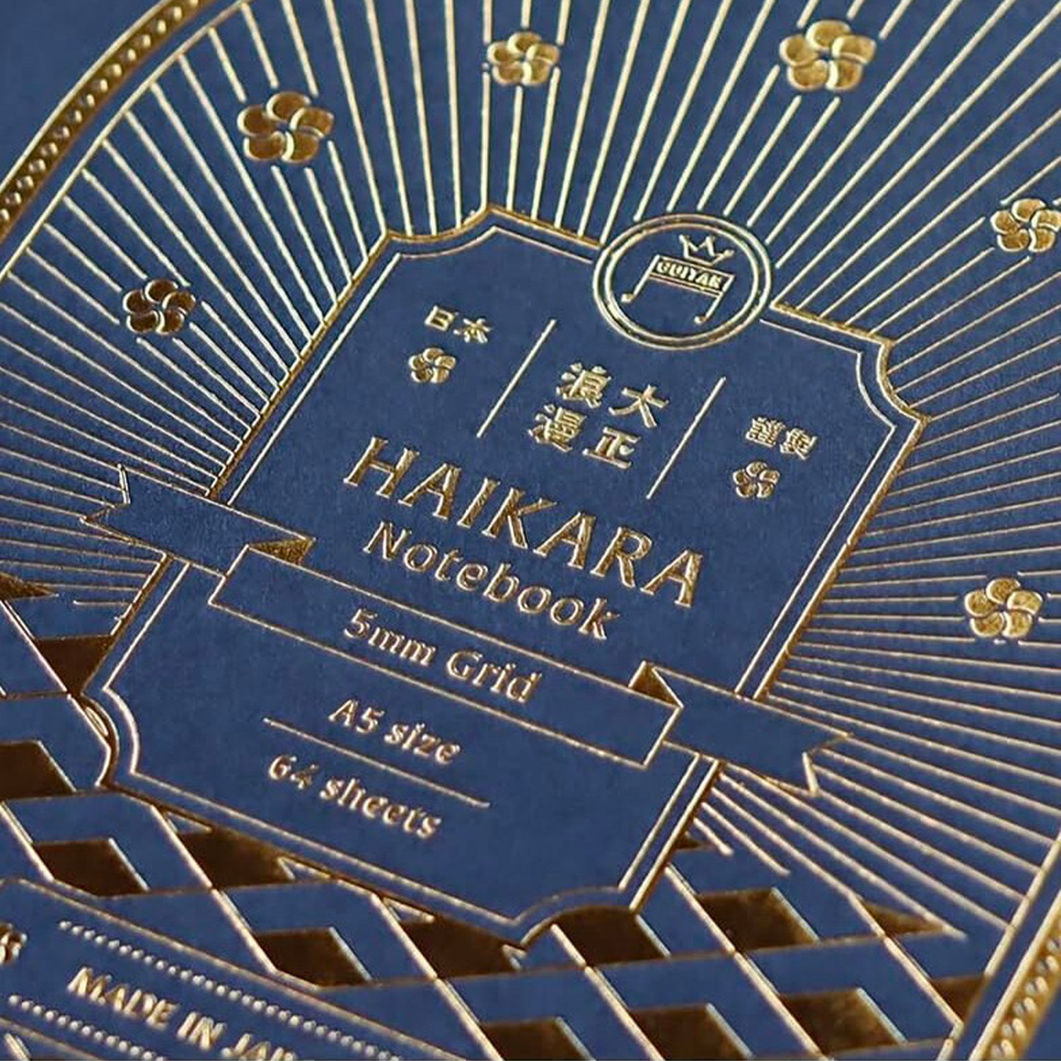 Geometric order meets vintage style in the Guitar Taisho Roman notebook produced by the renowned Teranishi Chemical Industry. This notebook, in a convenient A5 (148 × 210 mm) format, features a striking dark blue cover that evokes the scholarly atmosphere of the Japanese Taisho period. The rich gold foil finishes make it an elegant accessory for your desk or professional bag.