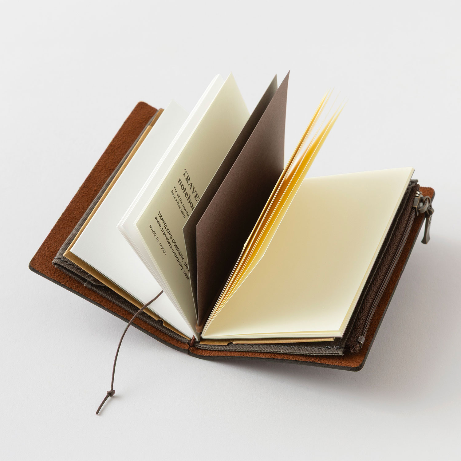 A cotton zipper case made from paraffin-treated thin cotton and sewn by artisans near Tokyo is also included. Insert it into the leather cover to use it as a wallet. The left pocket can hold cards or business cards, while the zippered pocket can store coins or keys. The brown version comes with a dark brown zipper case.