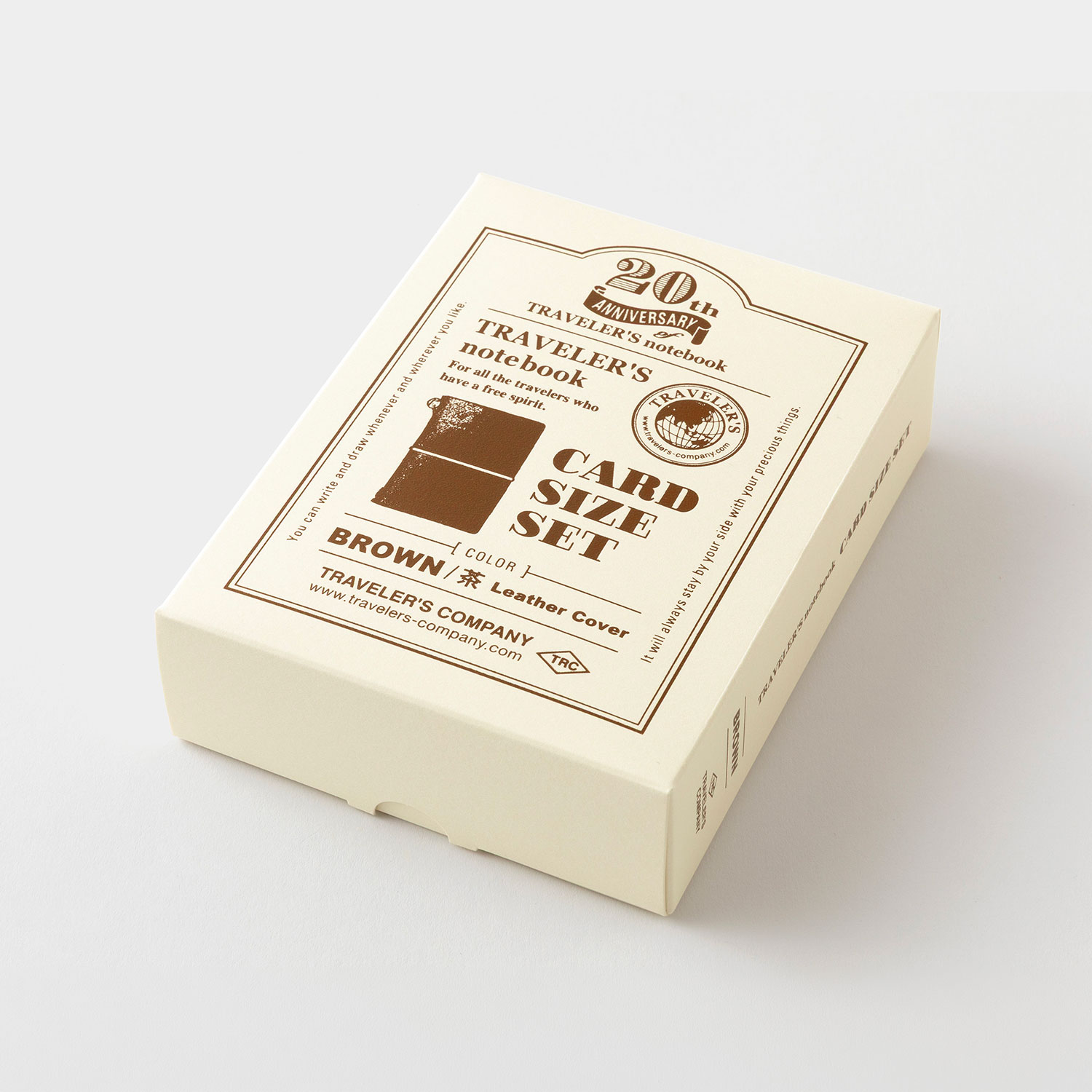 The Traveler’s Notebook Card Size 20th Anniversary Set Brown celebrates 20 years of Traveler’s Company with a new pocket-sized format. The brown leather cover includes notebooks and accessories that turn it into a wallet, card holder, or mini travel organizer.