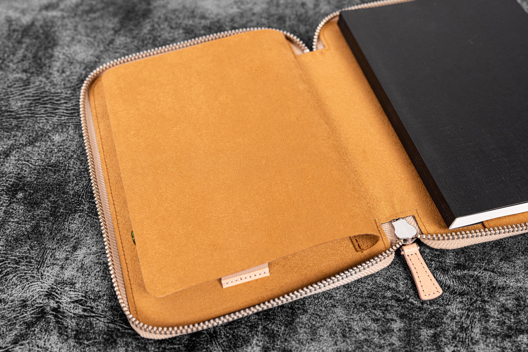 Galen Leather Zippered 10 Slots Pen Case with A5 notebook Undyed Leather holds up to 10 pens with a size up to 145 mm on left and an A5 notebook (not included) on right. A velvet lined interior protects the pens dividing the two sides. Use this leather pen holder to carry your favorite pens with a space for writing.