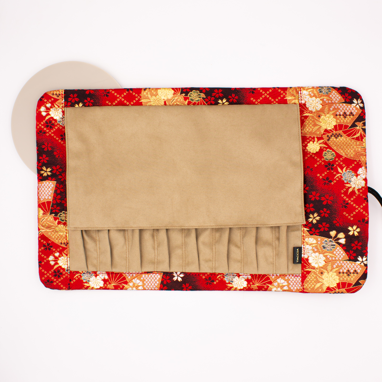Taccia Kimono Pen Roll Nishijin Sakura Festival is made with Nishijin Kinran, a traditional Japanese weaving technique that was developed and has evolved since the Fifth Century. It accepts until 8 pens in all dimensions.