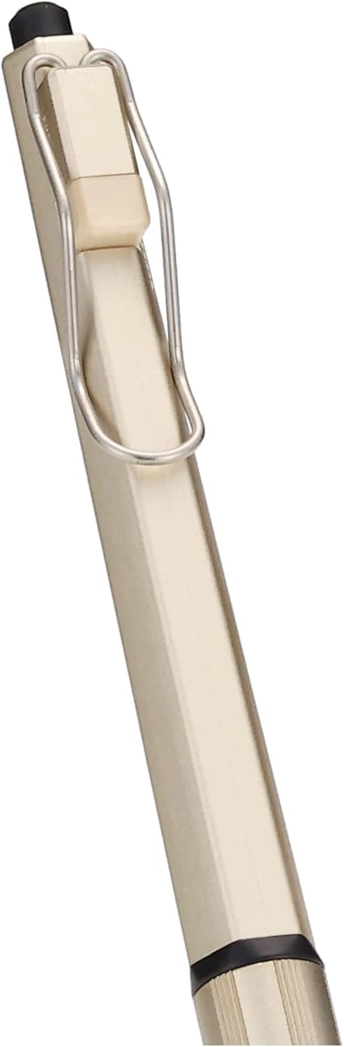 The pen features a hexagonal plastic barrel paired with a lightly ridged metal grip section for enhanced comfort and stability. Its body gradually widens toward the tip, creating a low center of gravity that improves balance and writing control.
