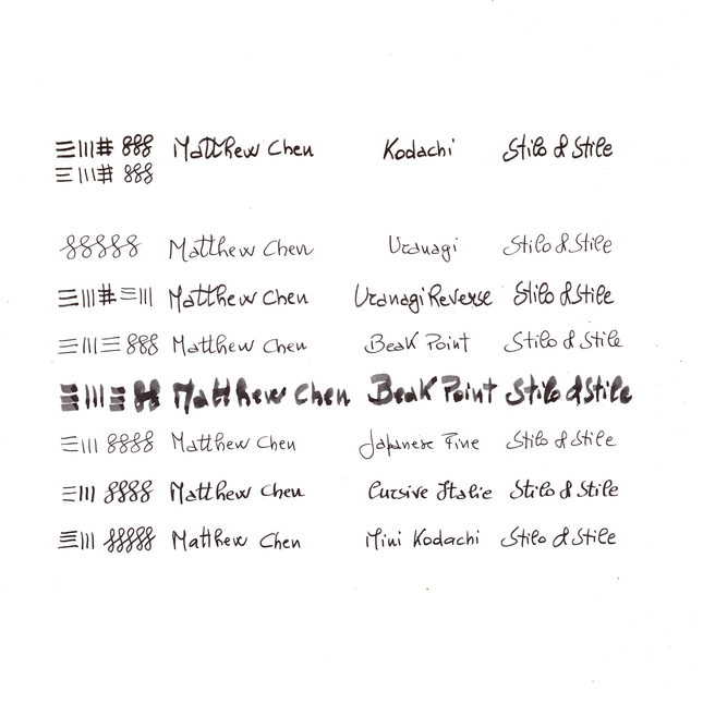 Matthew Chen spent a few years in Japan while studying and received guidance from Nagahara of Sailor for the Sailor's specialty nib grinds. Since his return to the United States, Matthew Chen has built a custom machine for nib grinding with the support and guidance of Michael Masuyama. Click here and visit the page where you can see the writing video of Matthew Chen nibs.